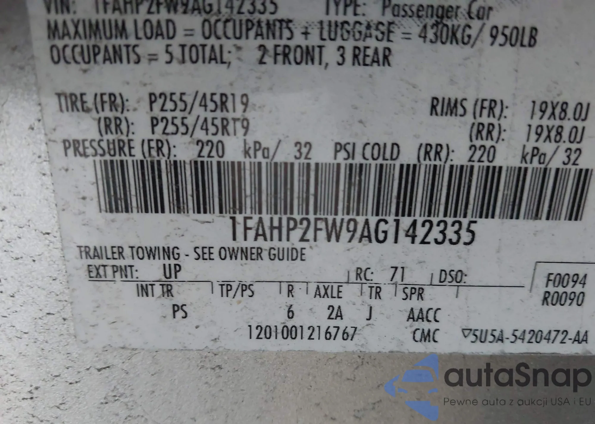LOT: 42112350 VIN: 1FAHP2FW9AG142335