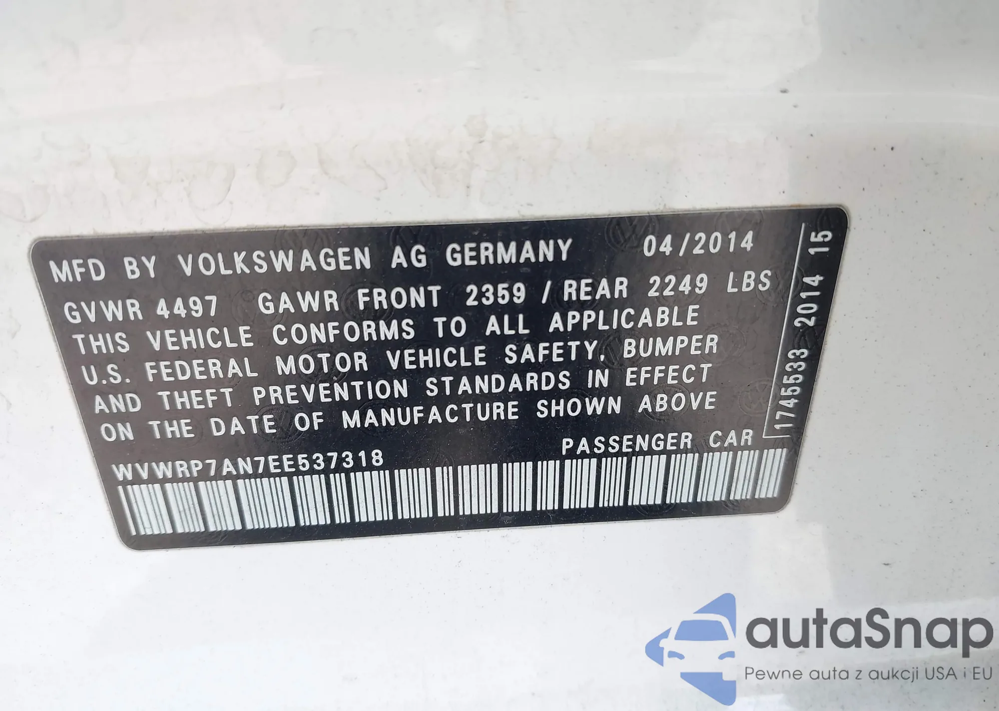 • VIN WVWRP7AN7EE537318