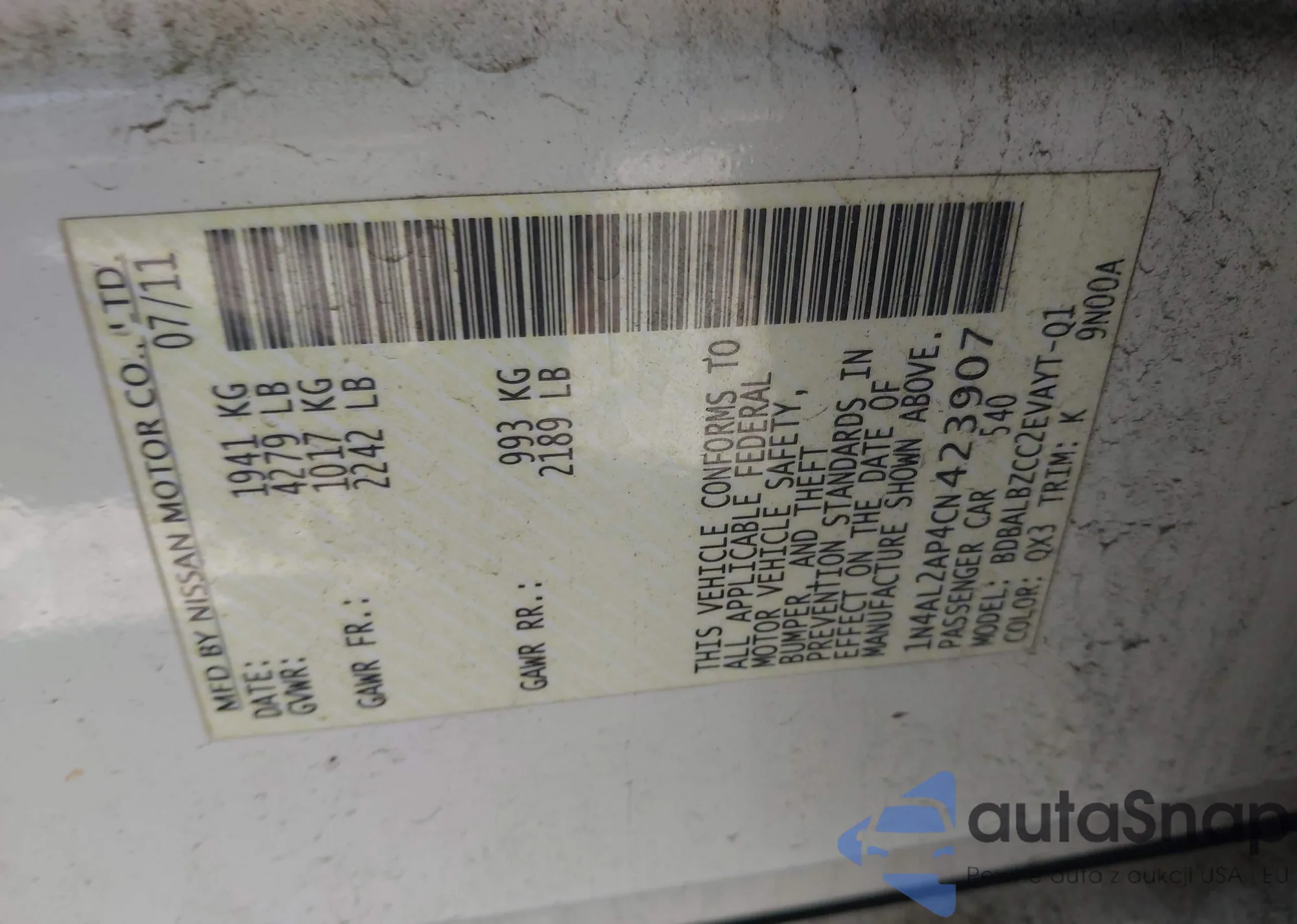 LOT: 42132521 VIN: 1N4AL2AP4CN423907