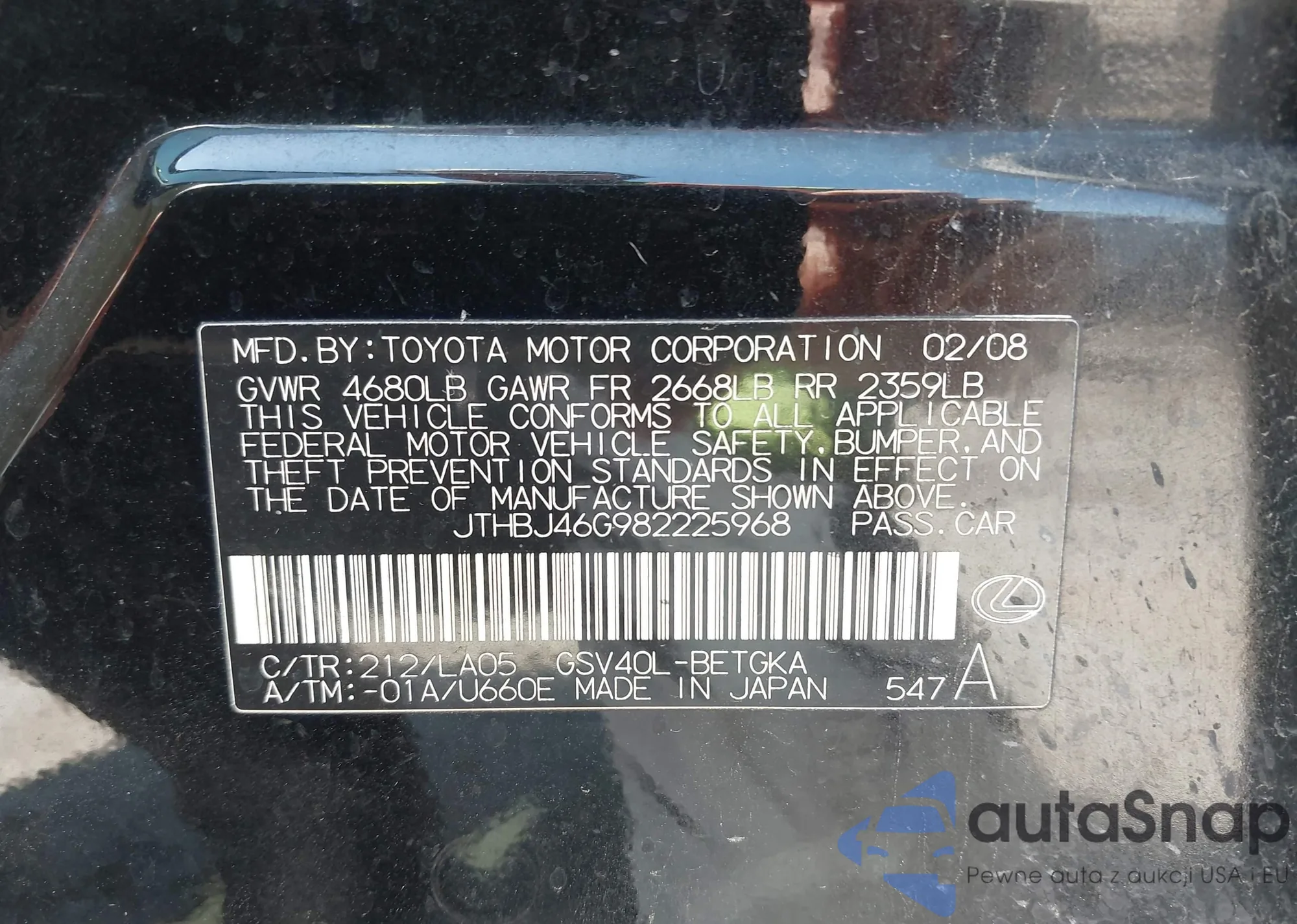 LOT: 41954614 VIN: JTHBJ46G982225968