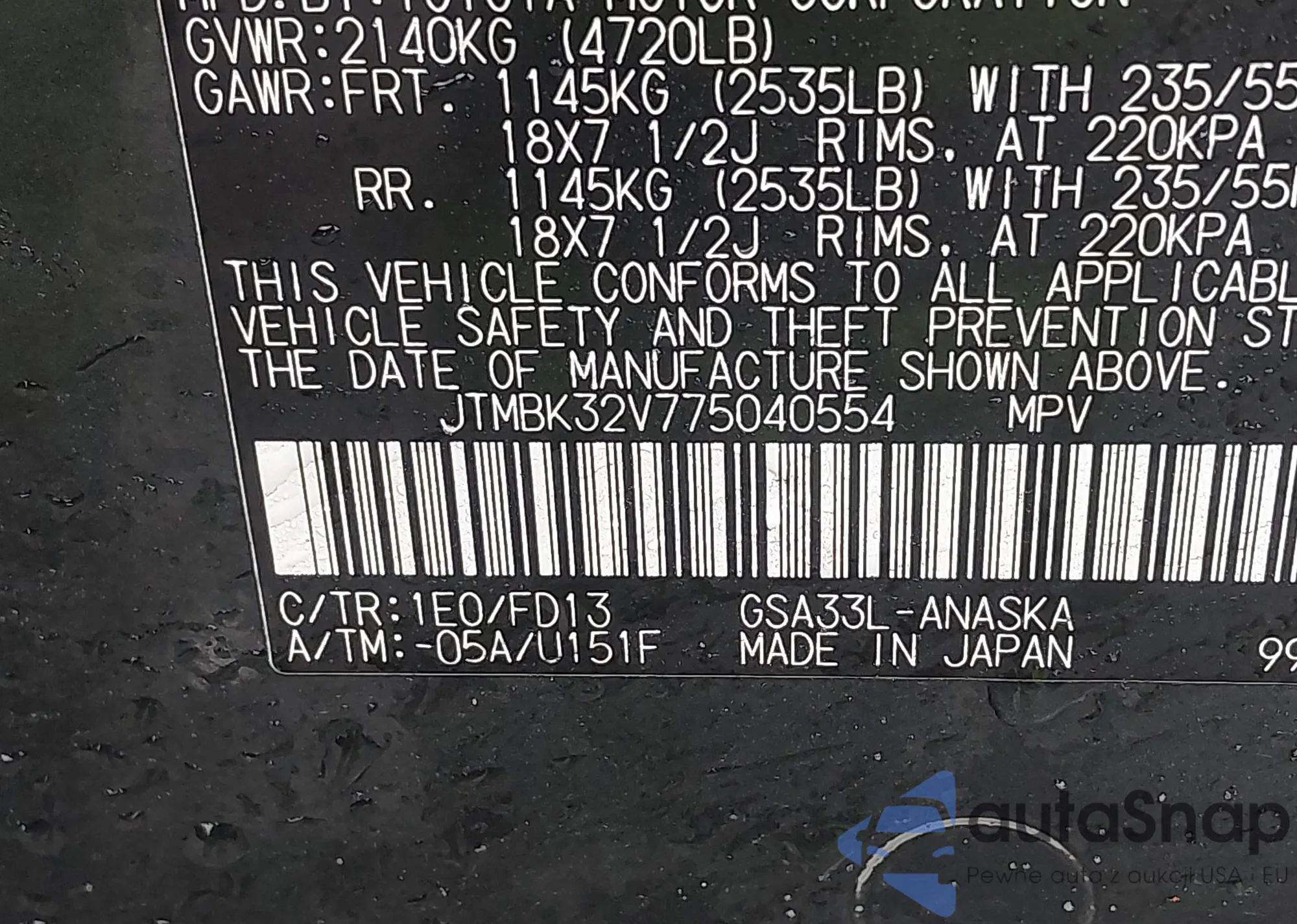 LOT: 42343859 VIN: 5J8TC2H53SL007303