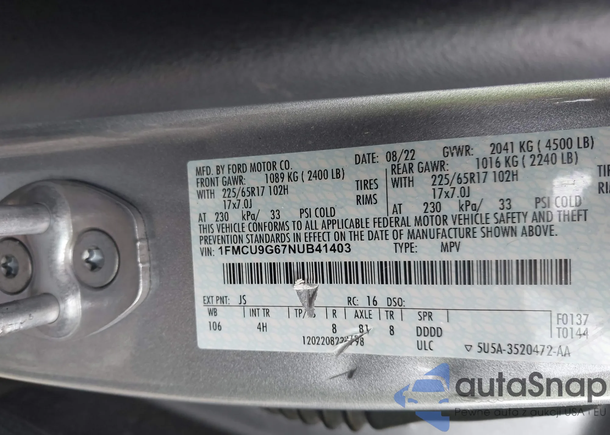 LOT: 42263205 VIN: 1FMCU9G67NUB41403