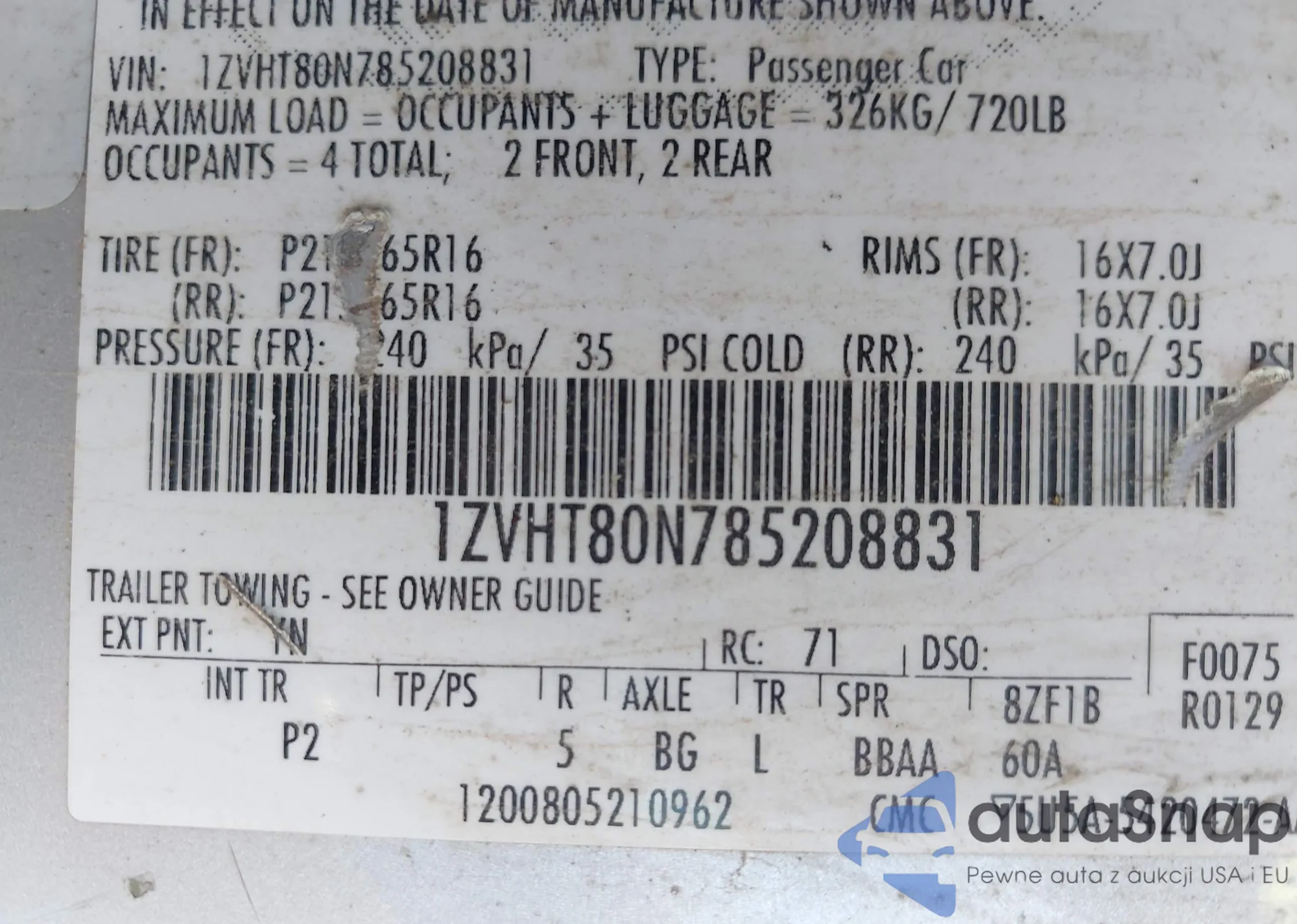 • VIN 1ZVHT80N785208831