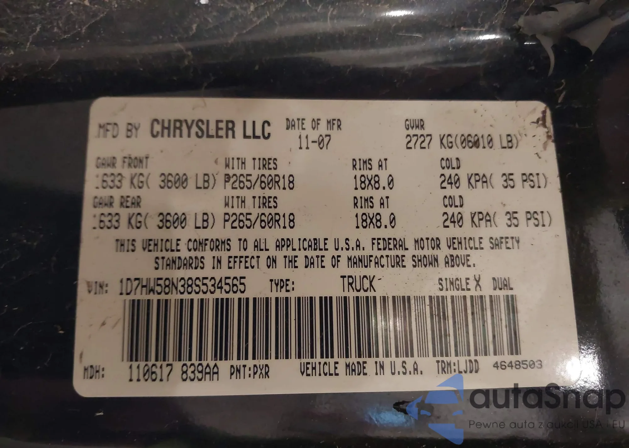 • VIN 1D7HW58N38S534565