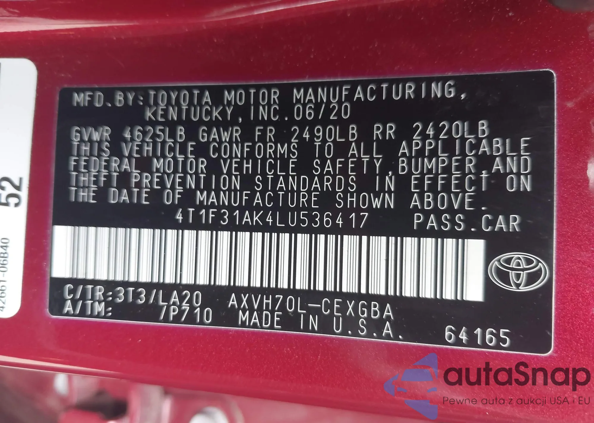 LOT: 42180254 VIN: 4T1F31AK4LU536417
