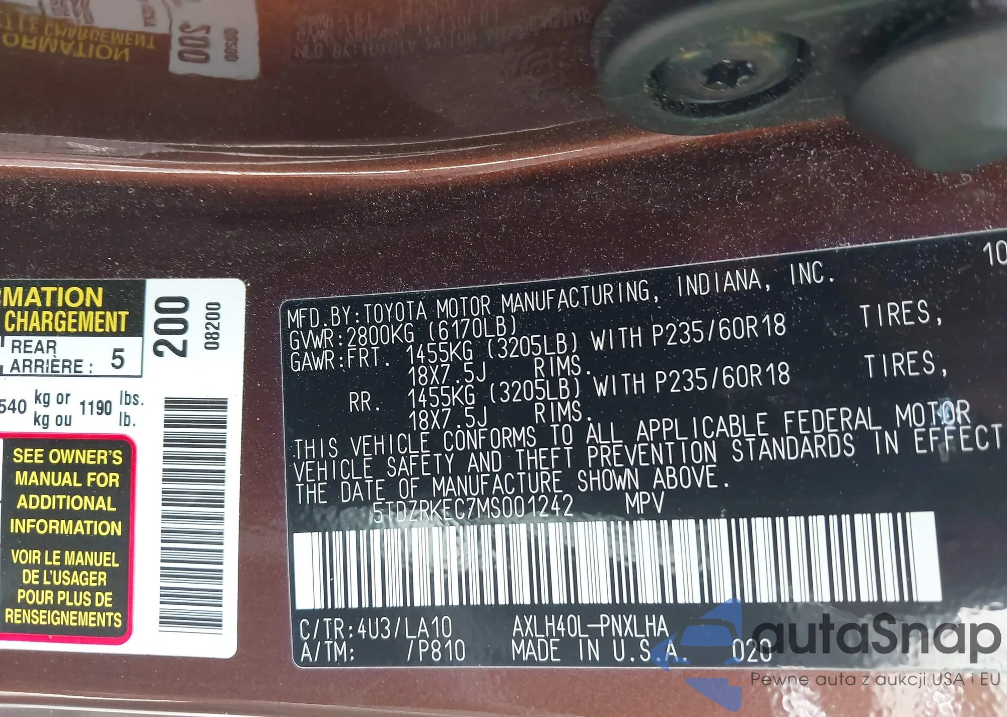 LOT: 42197486 VIN: 5TDZRKEC7MS001242