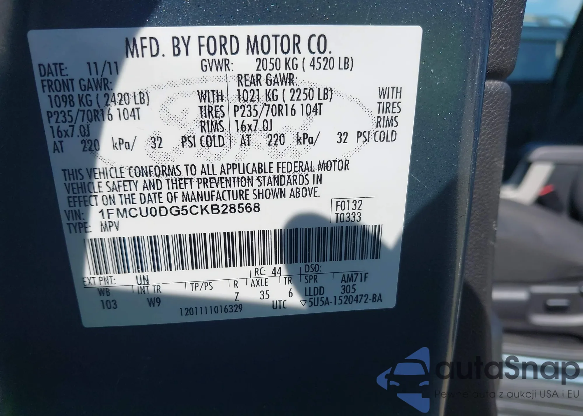 • VIN 1FMCU0DG5CKB28568