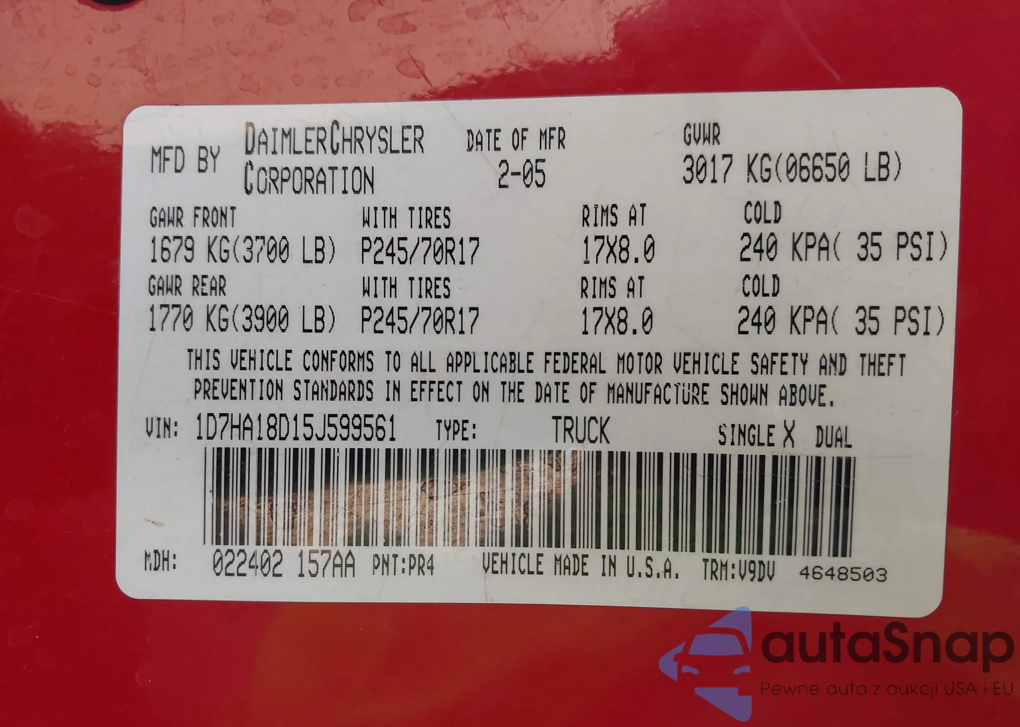 LOT: 42257502 VIN: 1D7HA18D15J599561