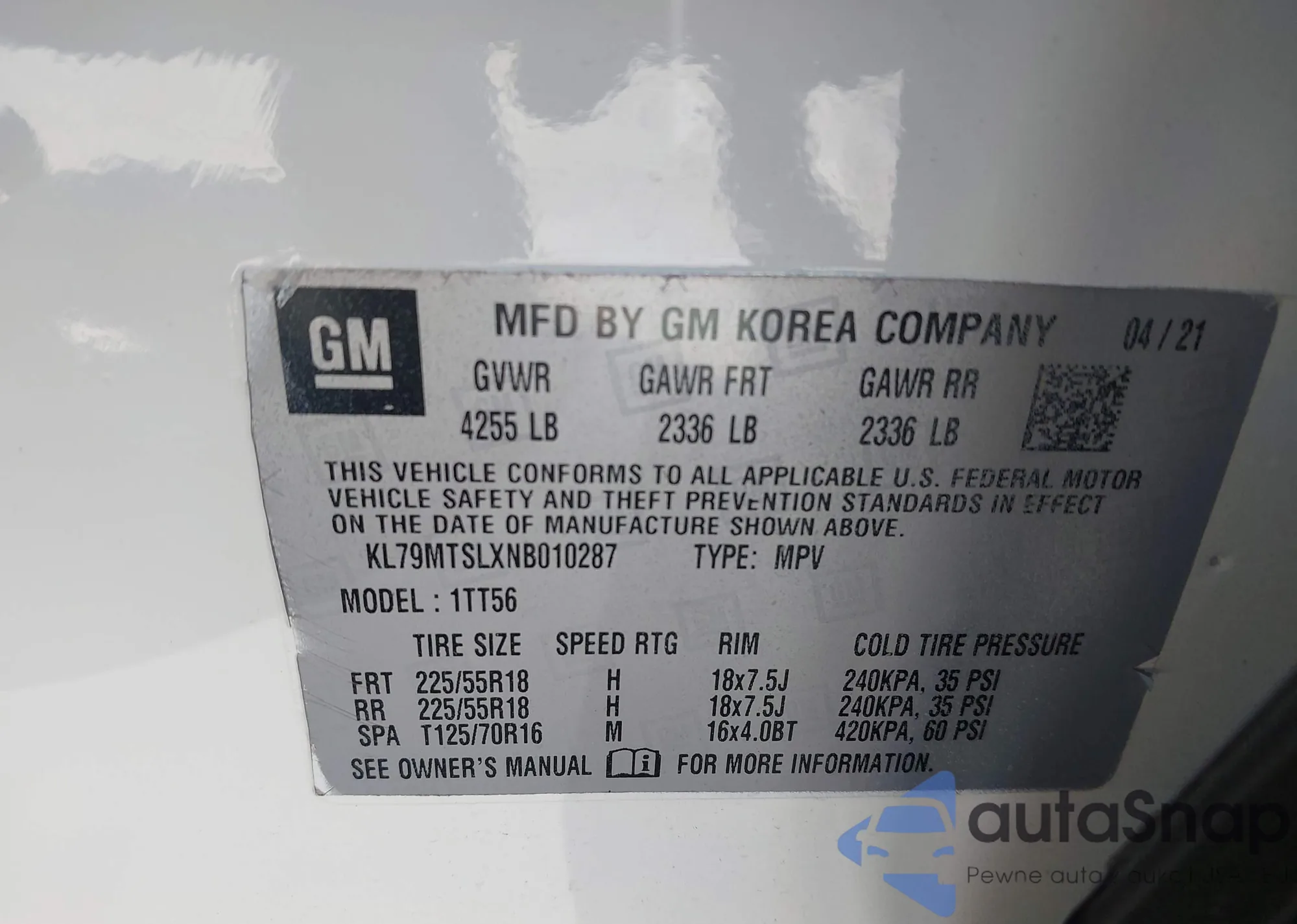 • VIN KL79MTSLXNB010287