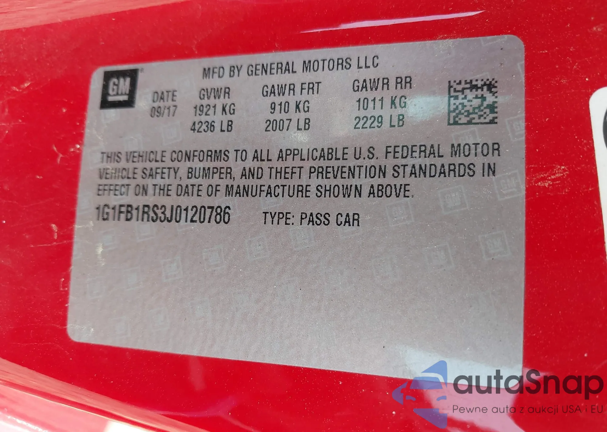 LOT: 41955729 VIN: 1G1FB1RS3J0120786