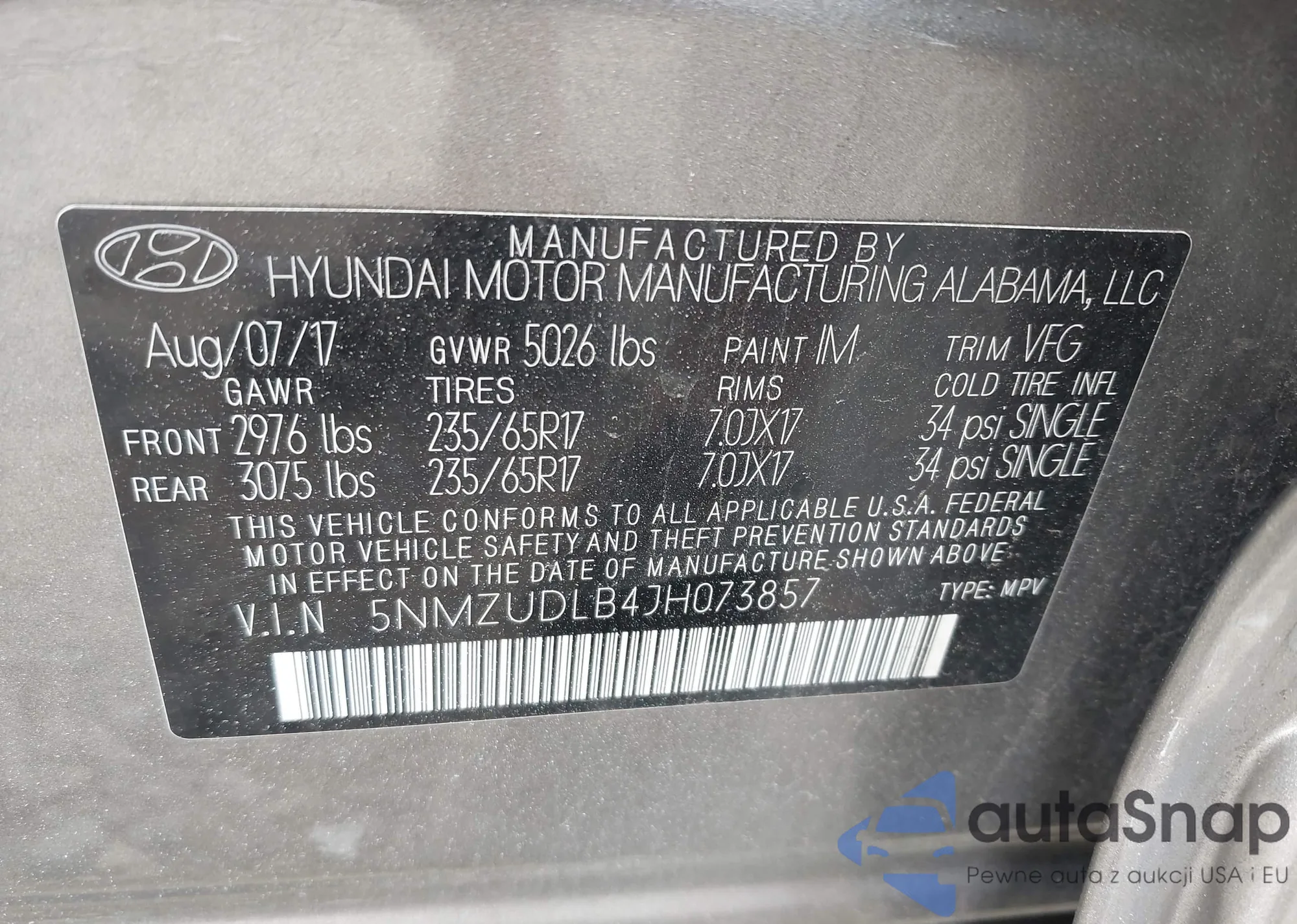 • VIN 5NMZUDLB4JH073857