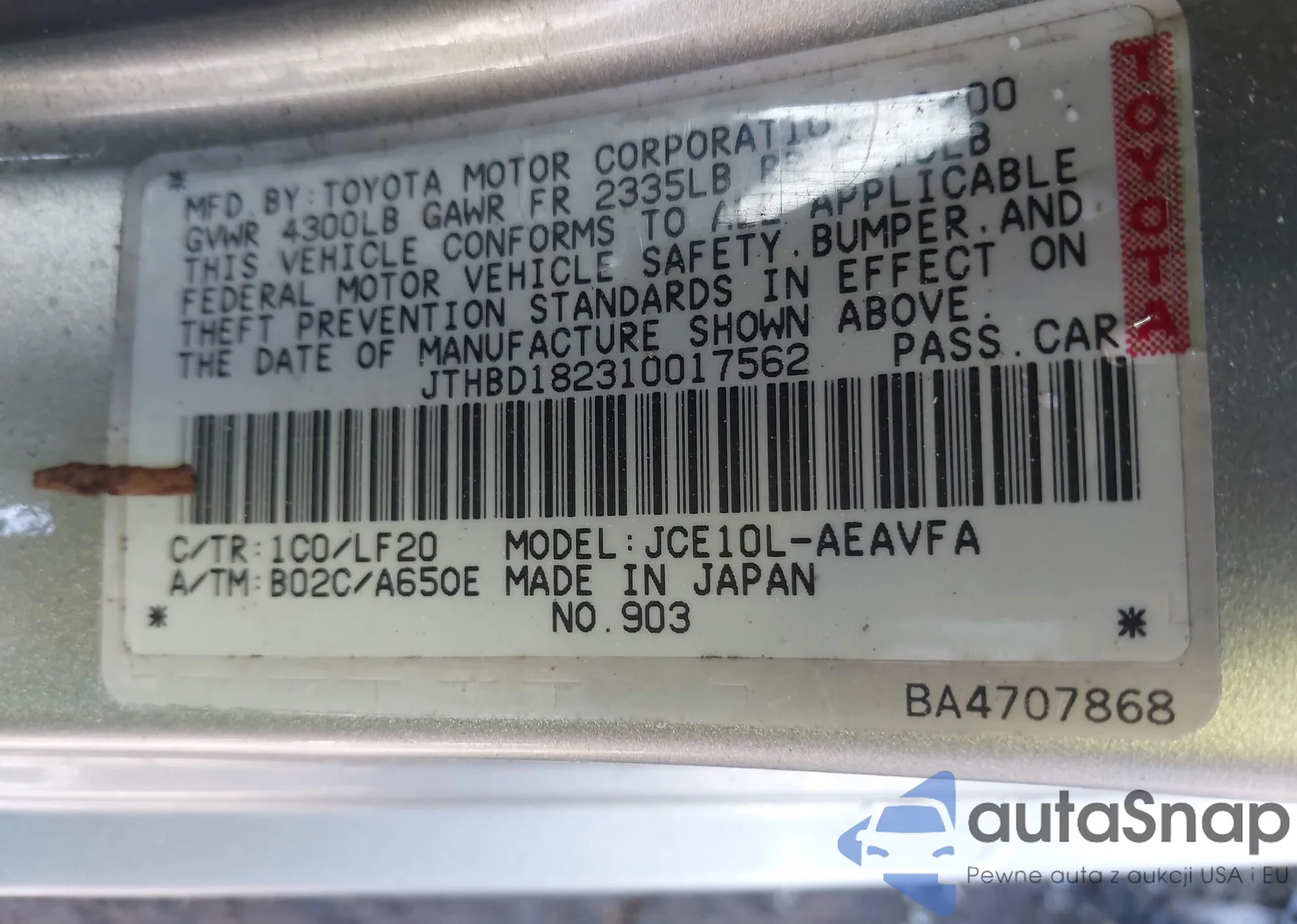 LOT: 41821030 VIN: JTHBD182310017562