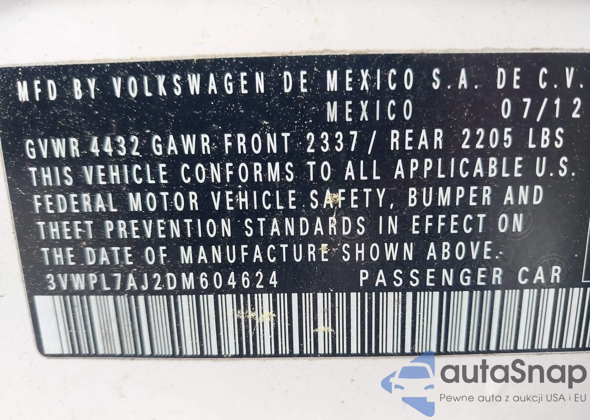• VIN 3VWPL7AJ2DM604624