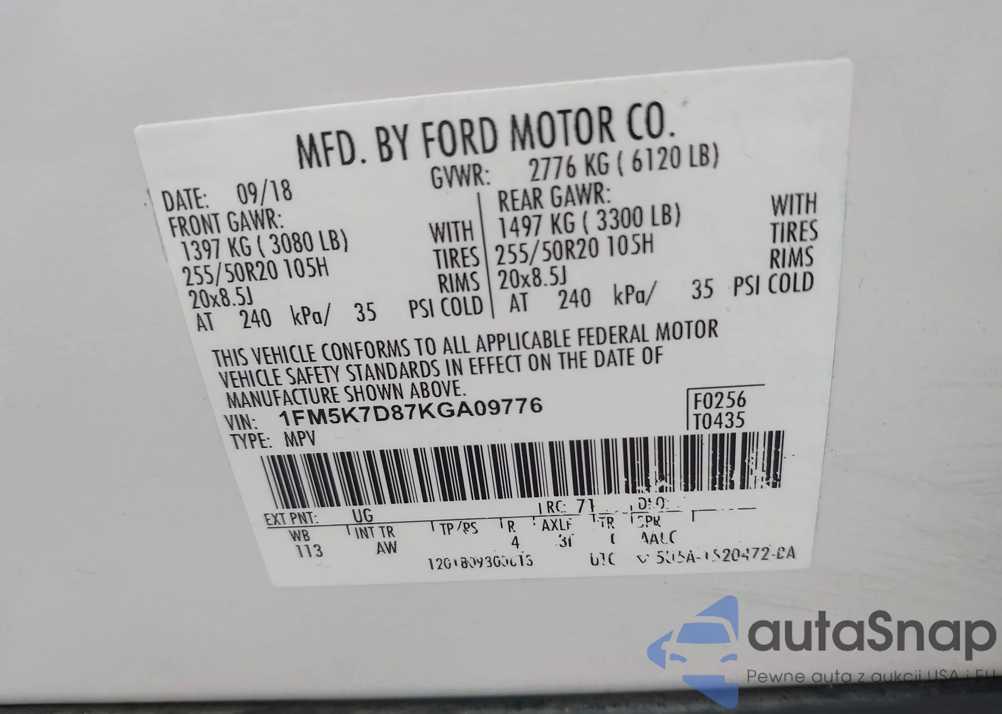 LOT: 42024344 VIN: 1FM5K7D87KGA09776