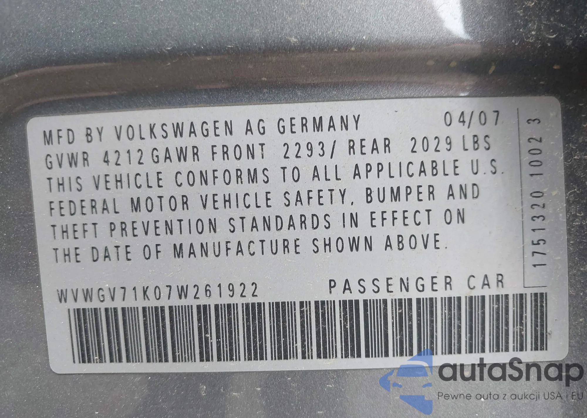 LOT: 42315419 VIN: WVWGV71K07W261922