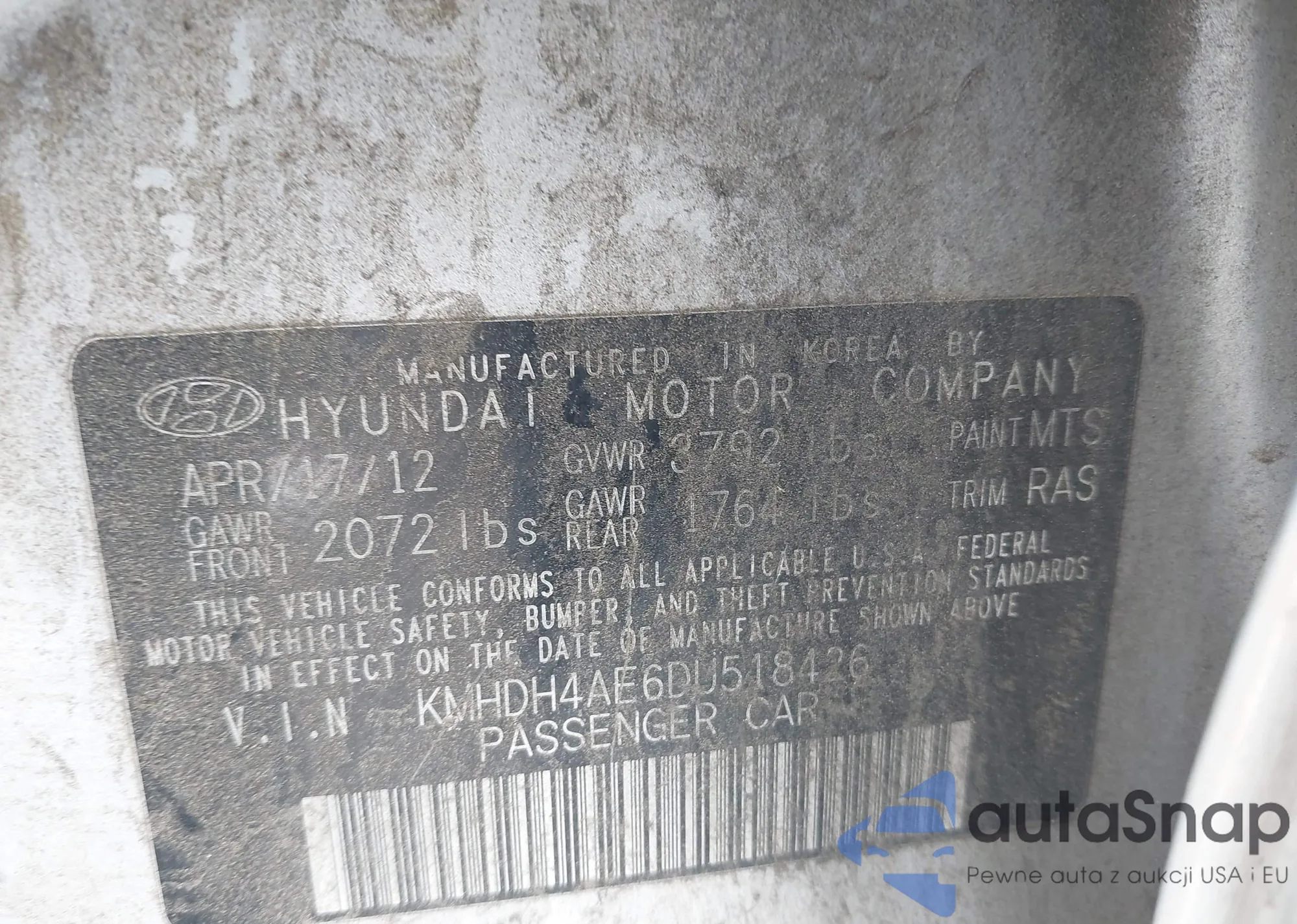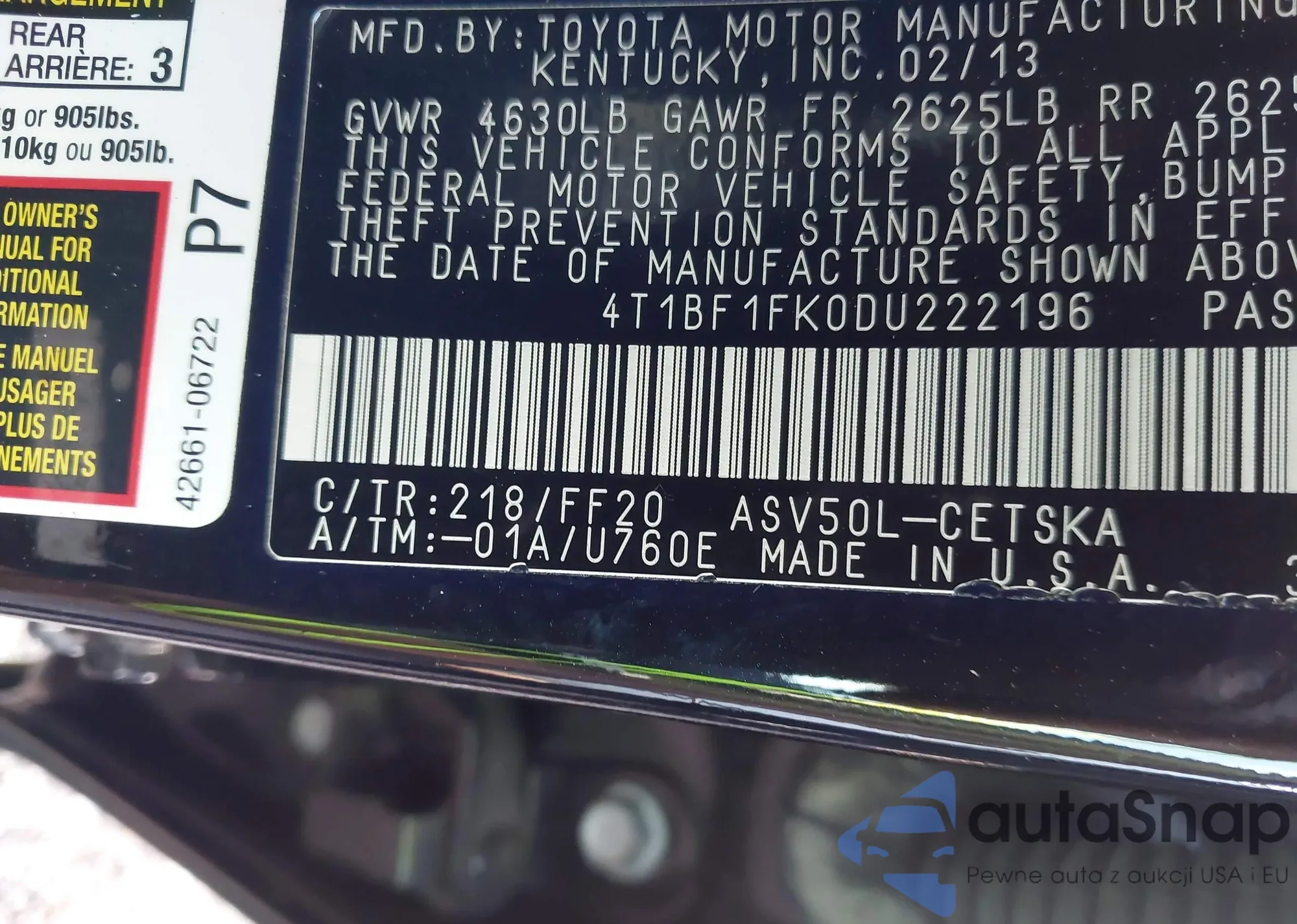 LOT: 39794872 VIN: 4T1BF1FK0DU222196