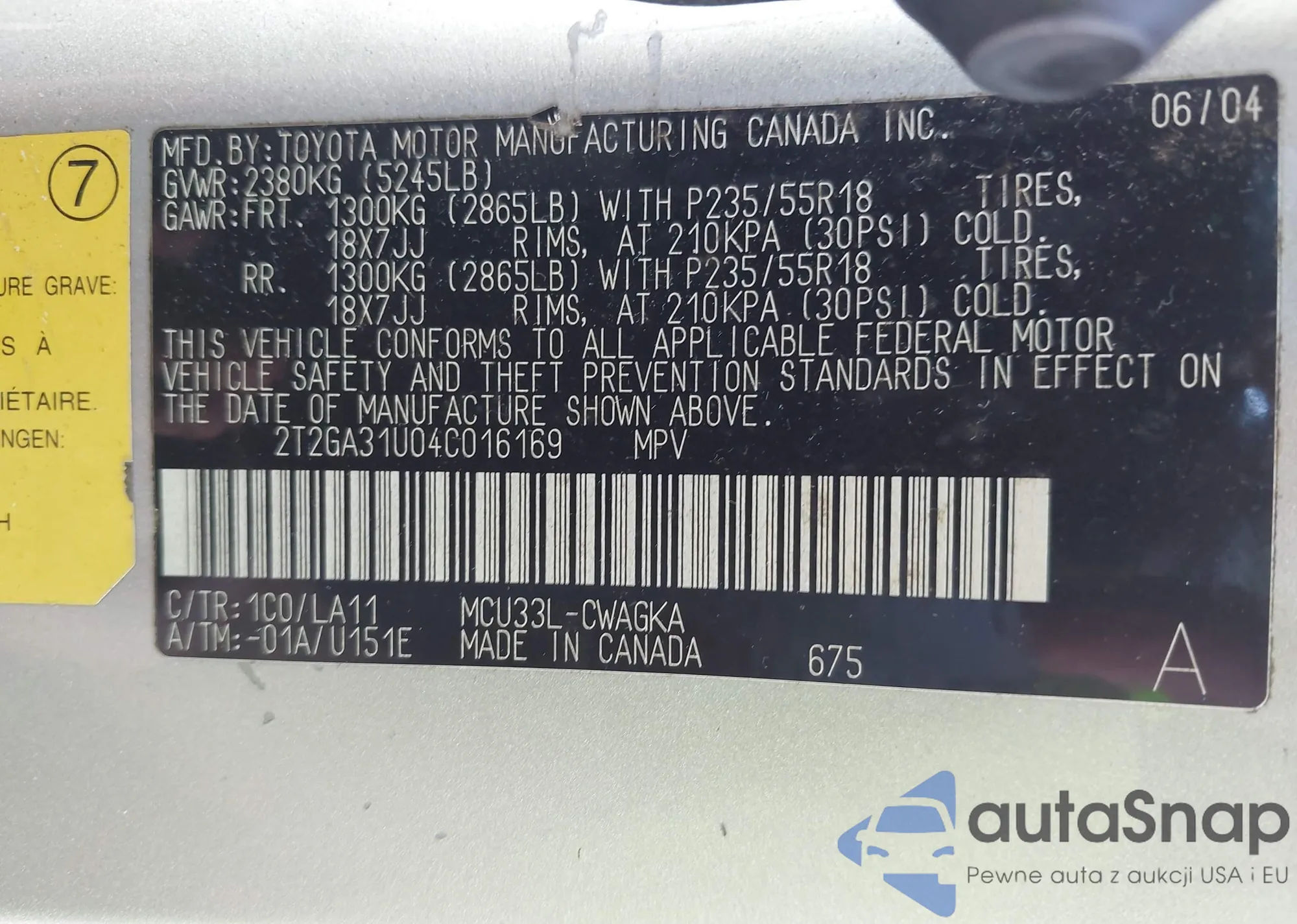 LOT: 41707607 VIN: 2T2GA31U04C016169