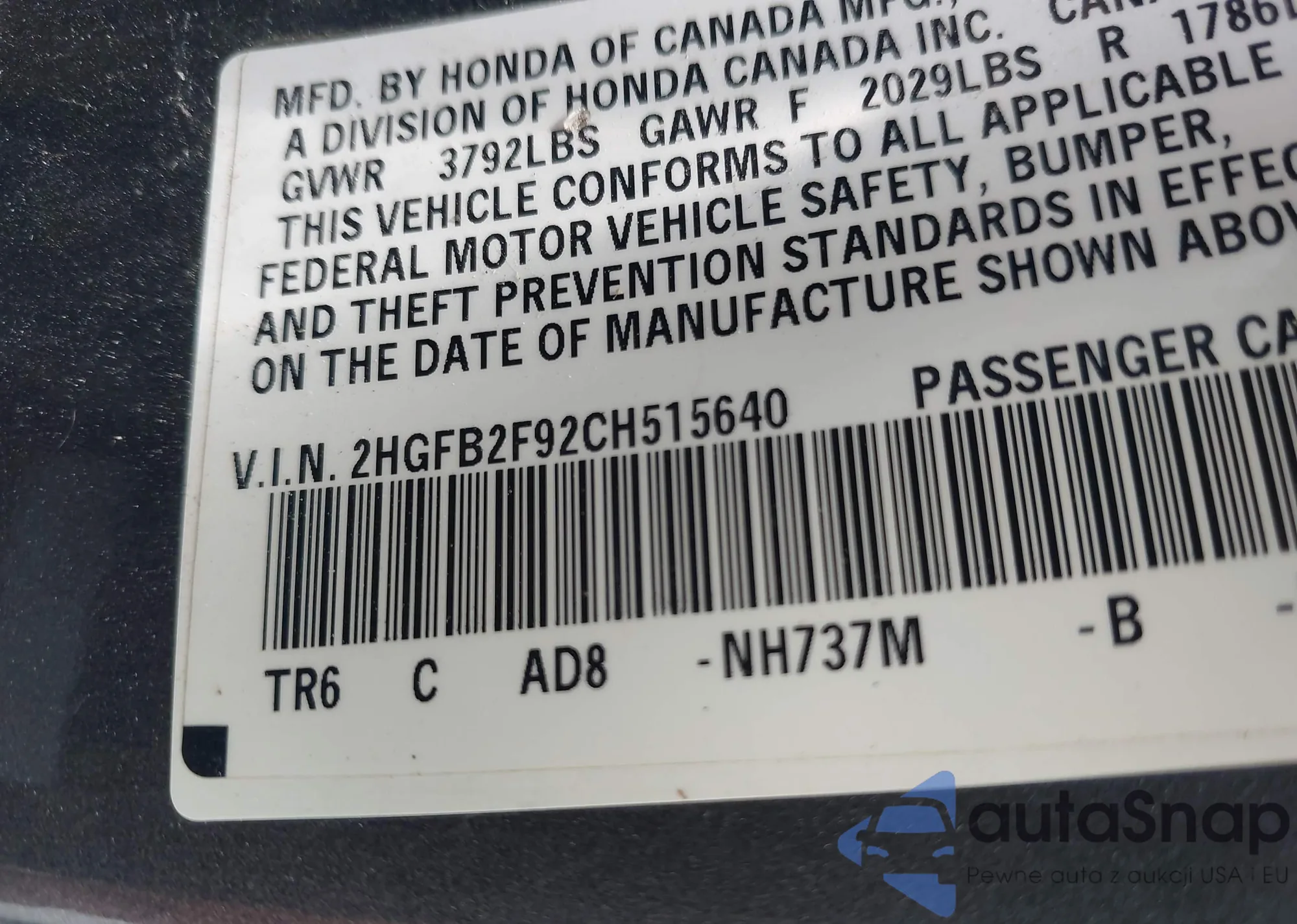 • VIN 2HGFB2F92CH515640