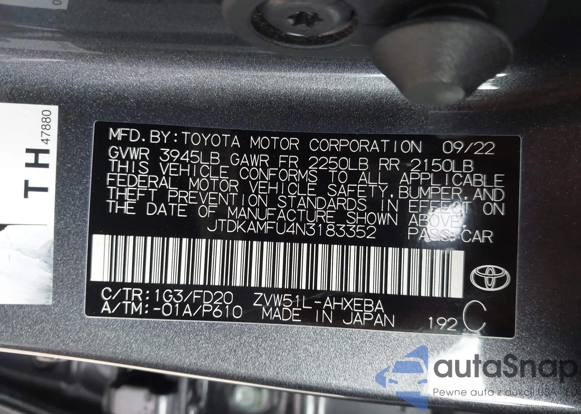 LOT: 42170623 VIN: JTDKAMFU4N3183352