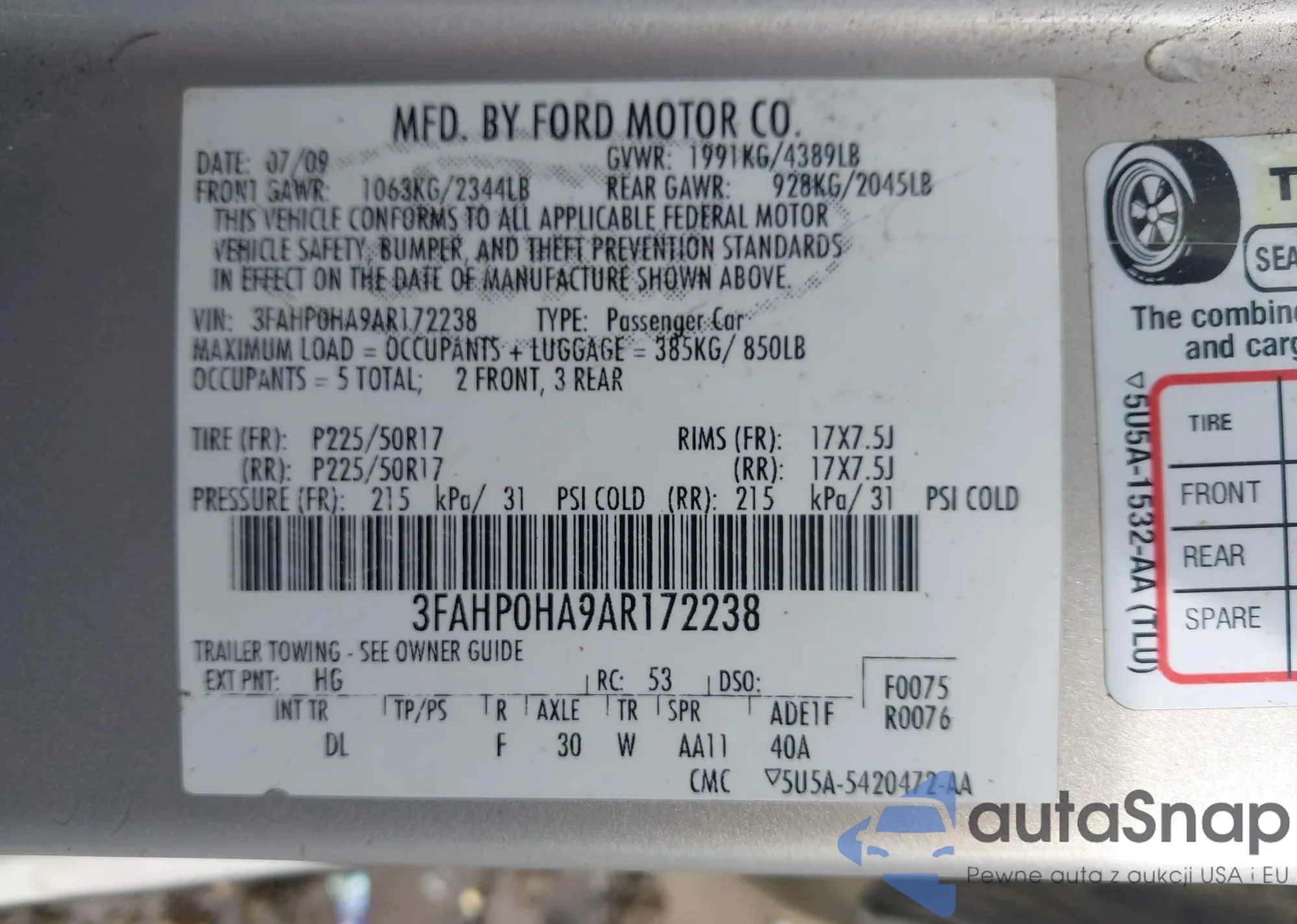 • VIN 3FAHP0HA9AR172238