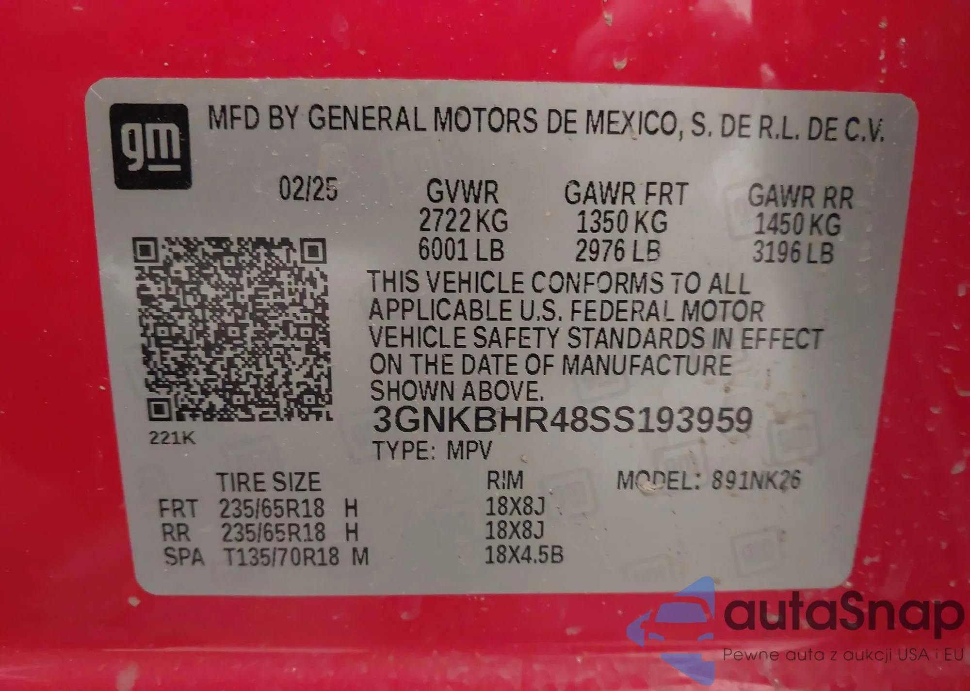 LOT: 42204604 VIN: 3GNKBHR48SS193959