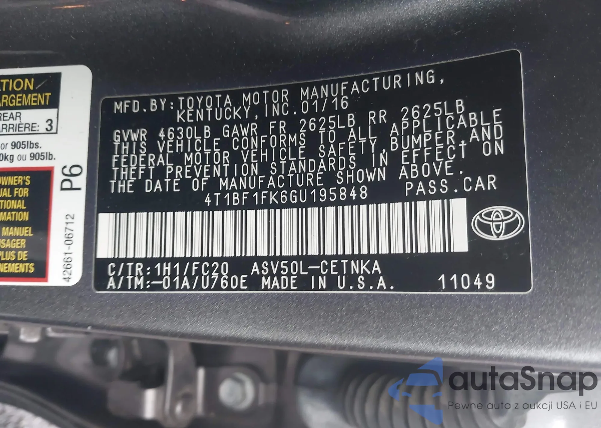 LOT: 42267917 VIN: 4T1BF1FK6GU195848
