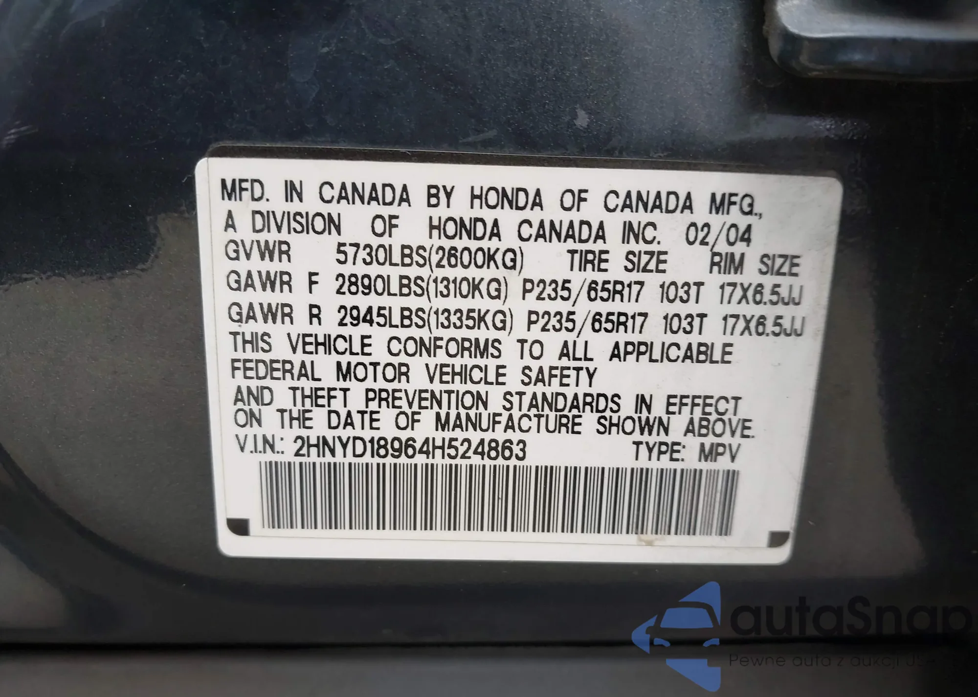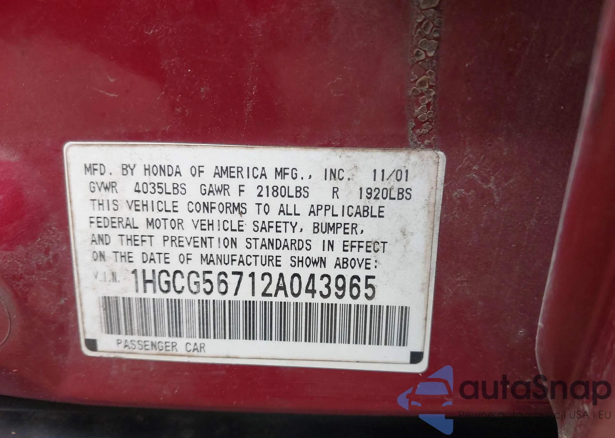 LOT: 42287036 VIN: 1HGCG56712A043965