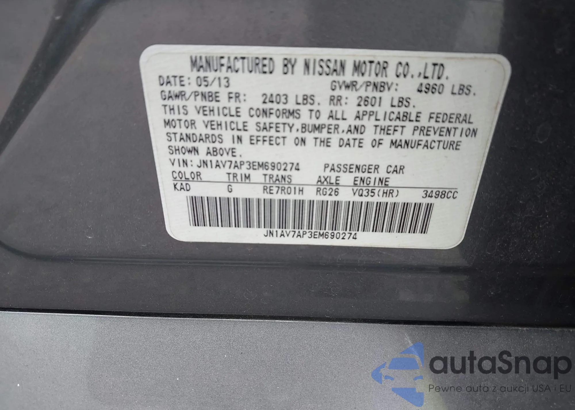 LOT: 42364775 VIN: JN1AV7AP3EM690274