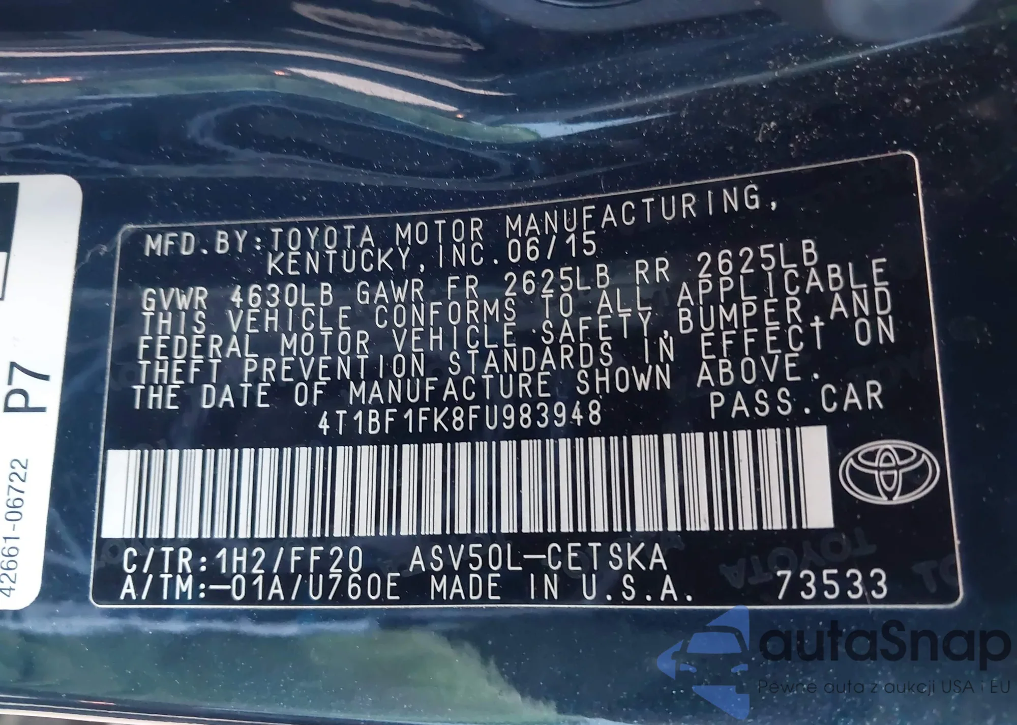 LOT: 42021095 VIN: 4T1BF1FK8FU983948