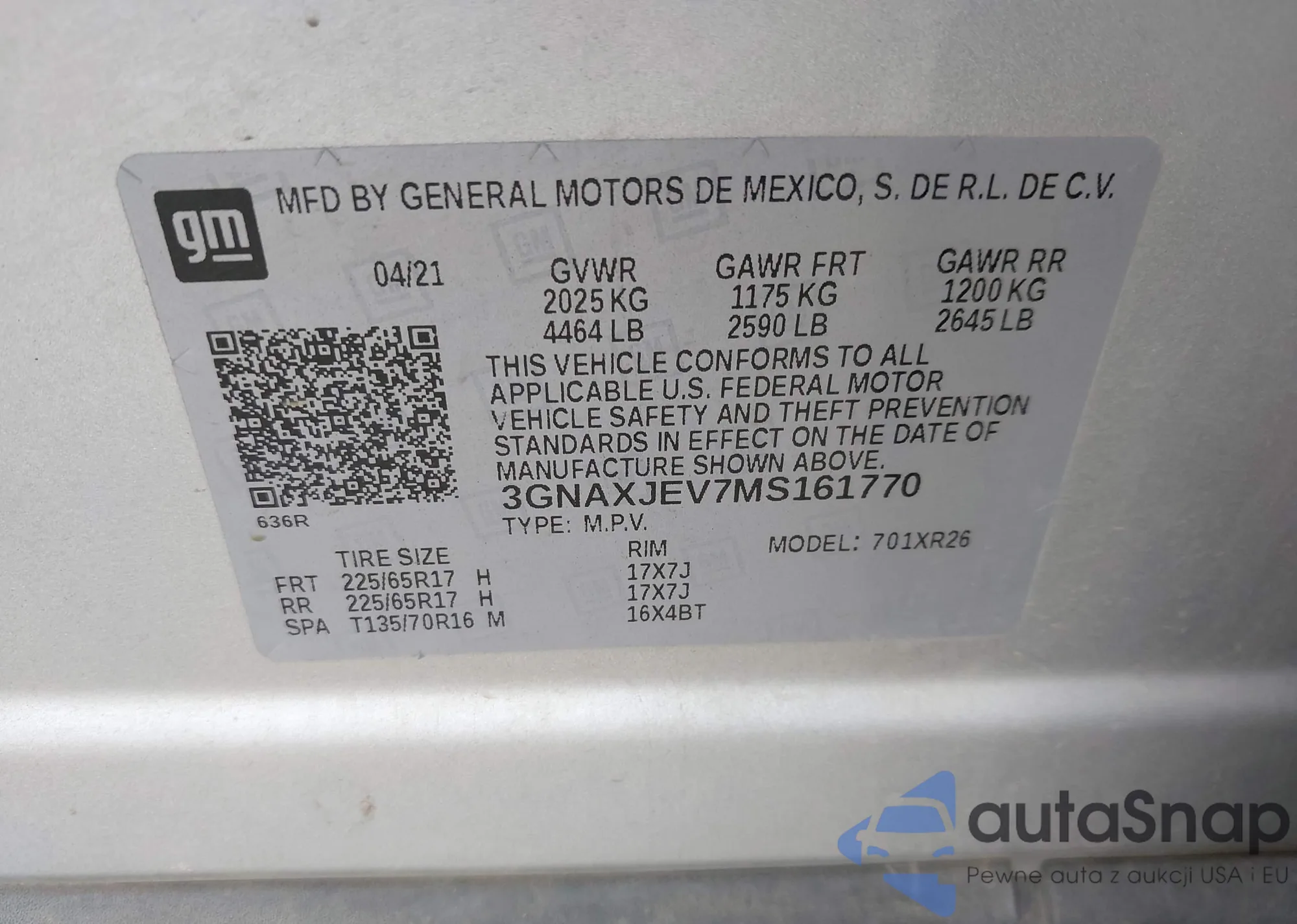 • VIN 3GNAXJEV7MS161770