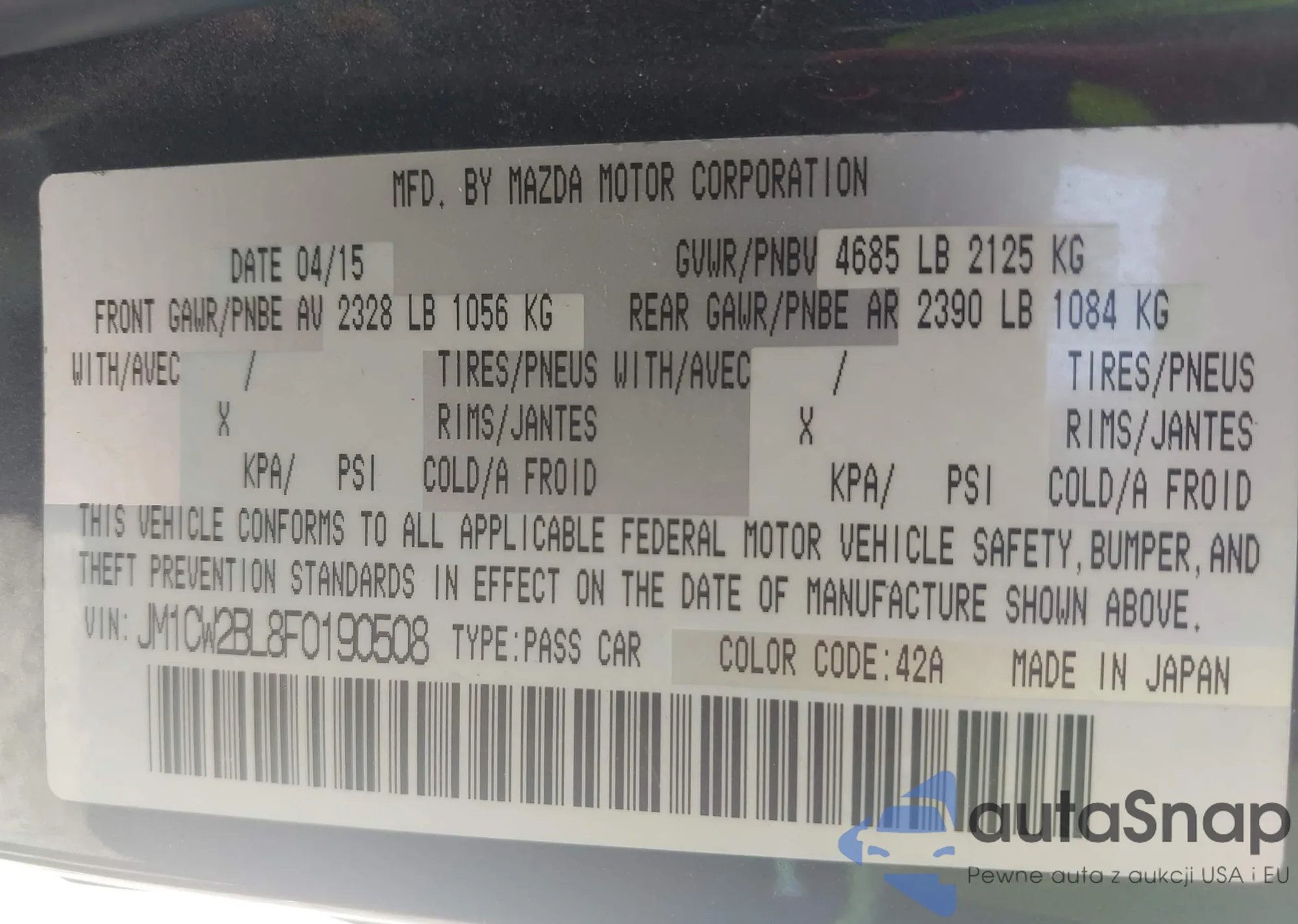 LOT: 42226724 VIN: JM1CW2BL8F0190508