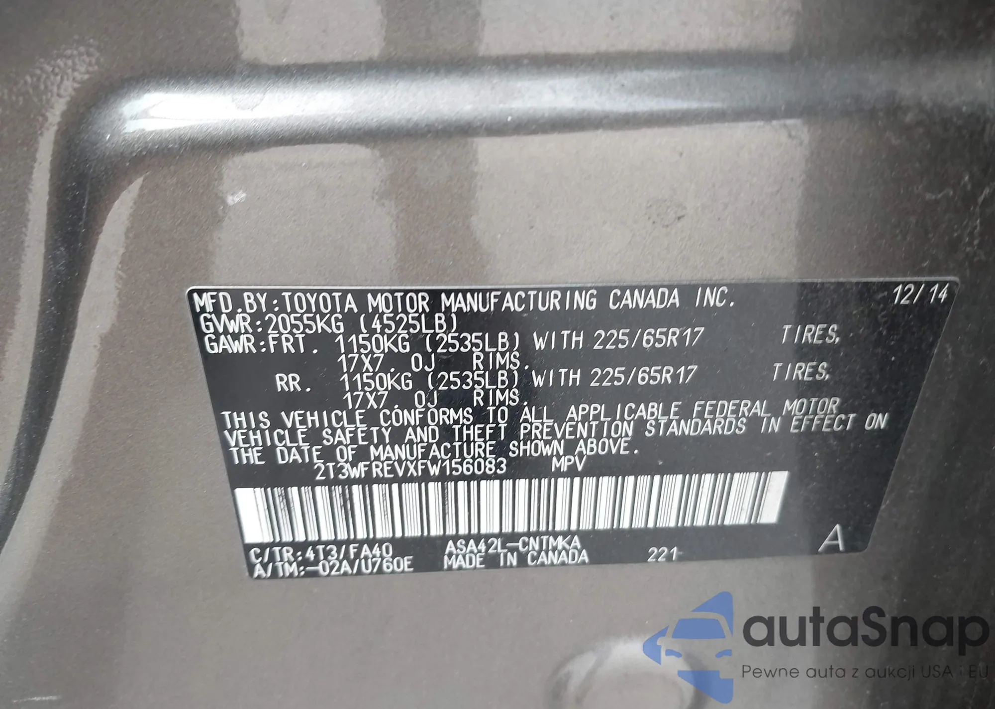 LOT: 41790876 VIN: 2T3WFREVXFW156083