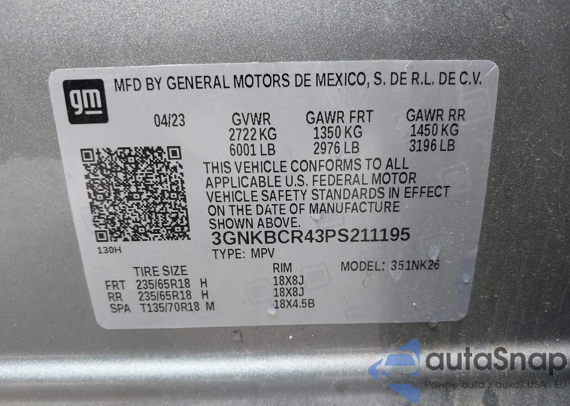 • VIN 3GNKBCR43PS211195