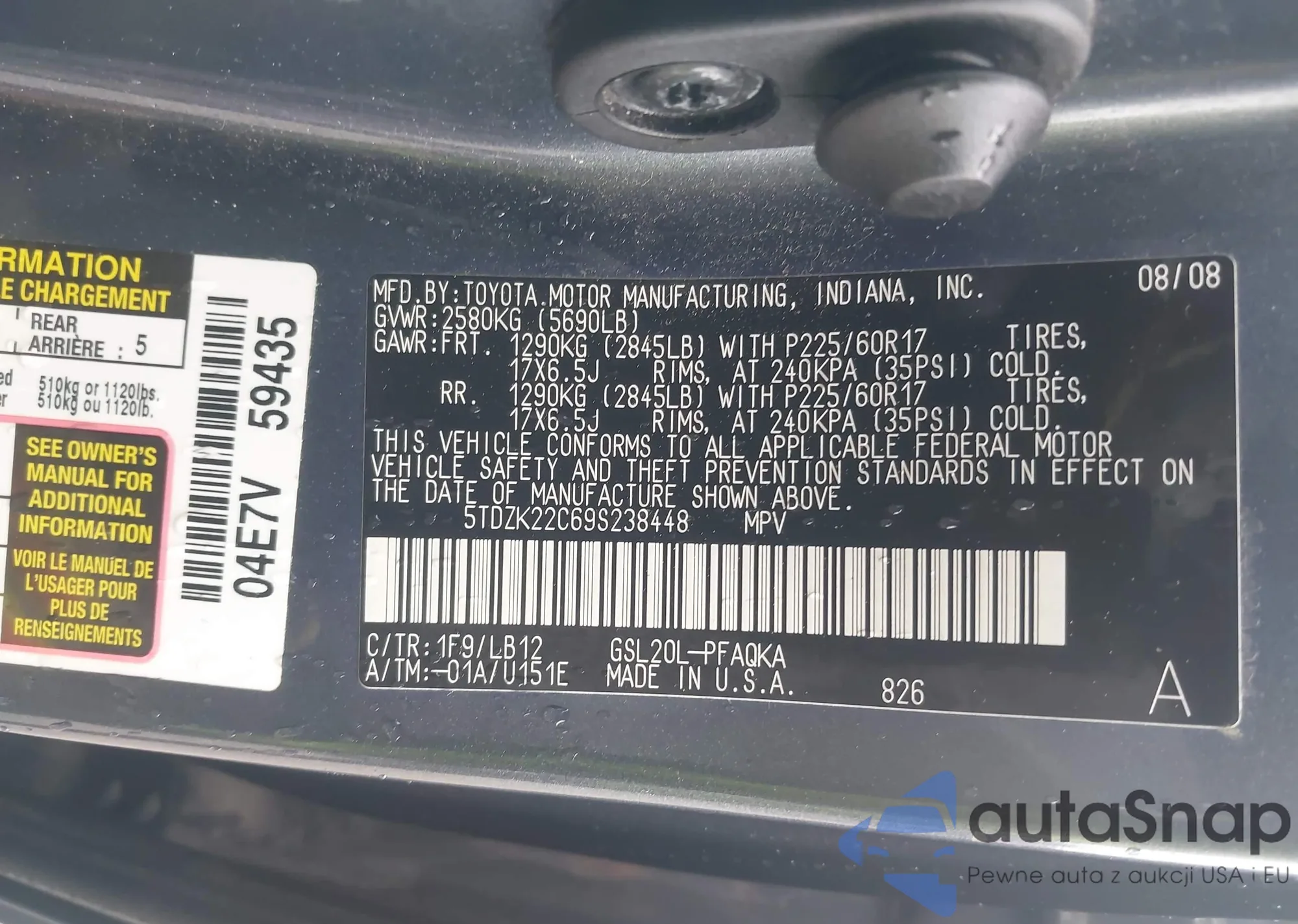 LOT: 42221834 VIN: 5TDZK22C69S238448