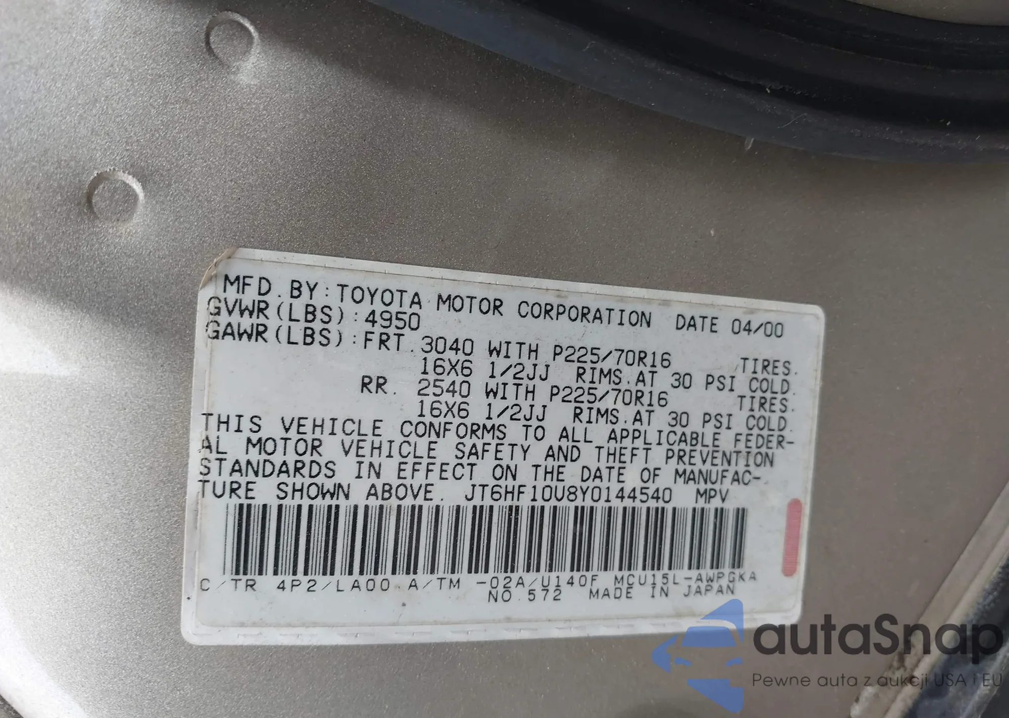LOT: 42262376 VIN: JT6HF10U8Y0144540