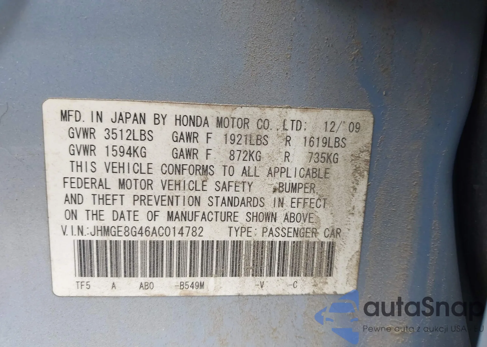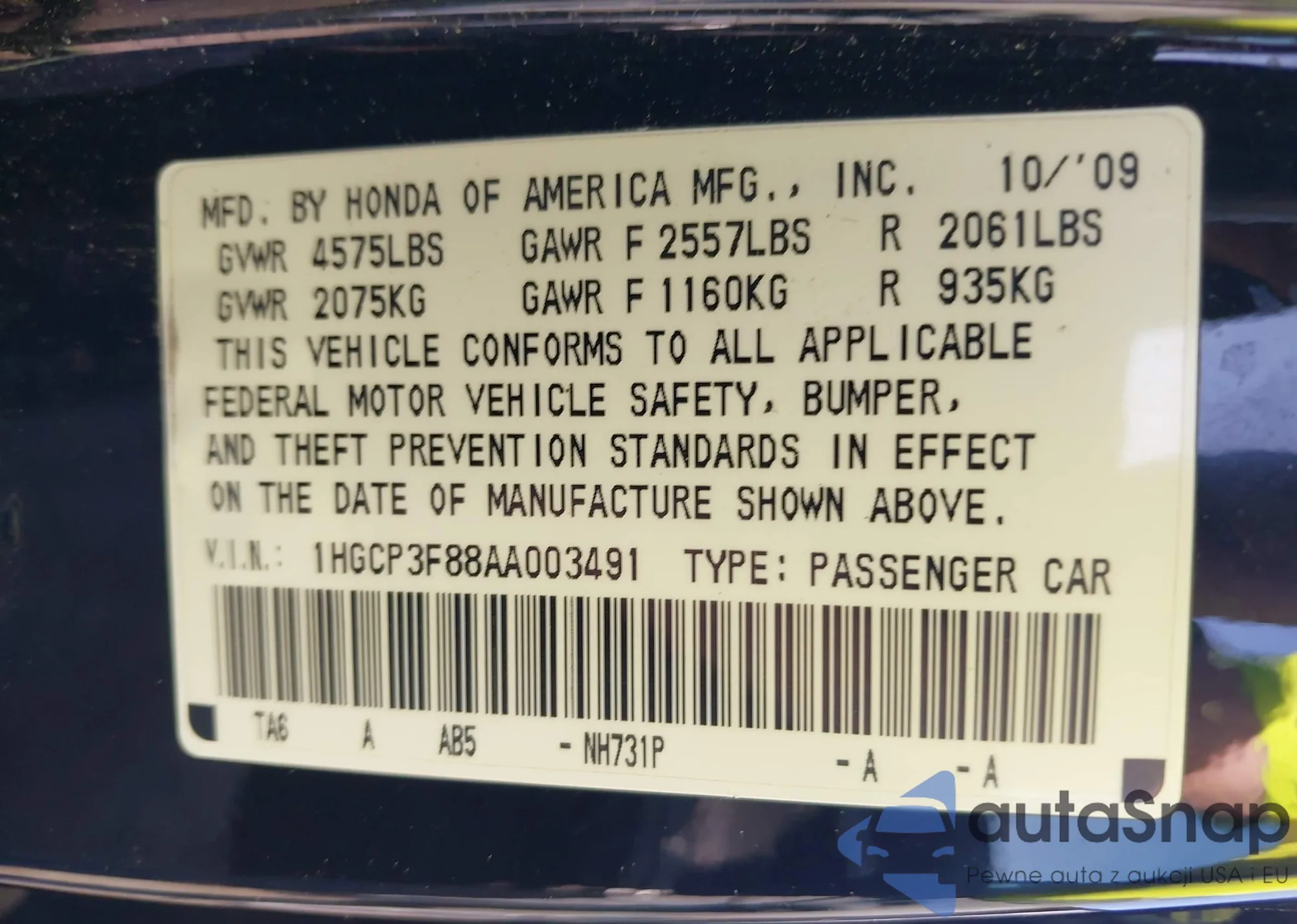 • VIN 5J6RE48349L010874