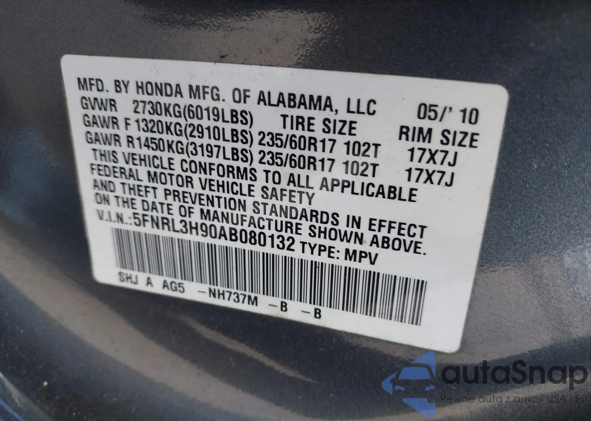 • VIN 5FNRL3H90AB080132