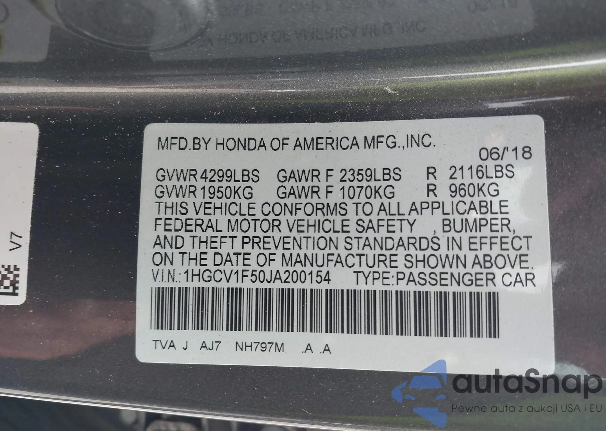 LOT: 42323989 VIN: 1HGCV1F50JA200154