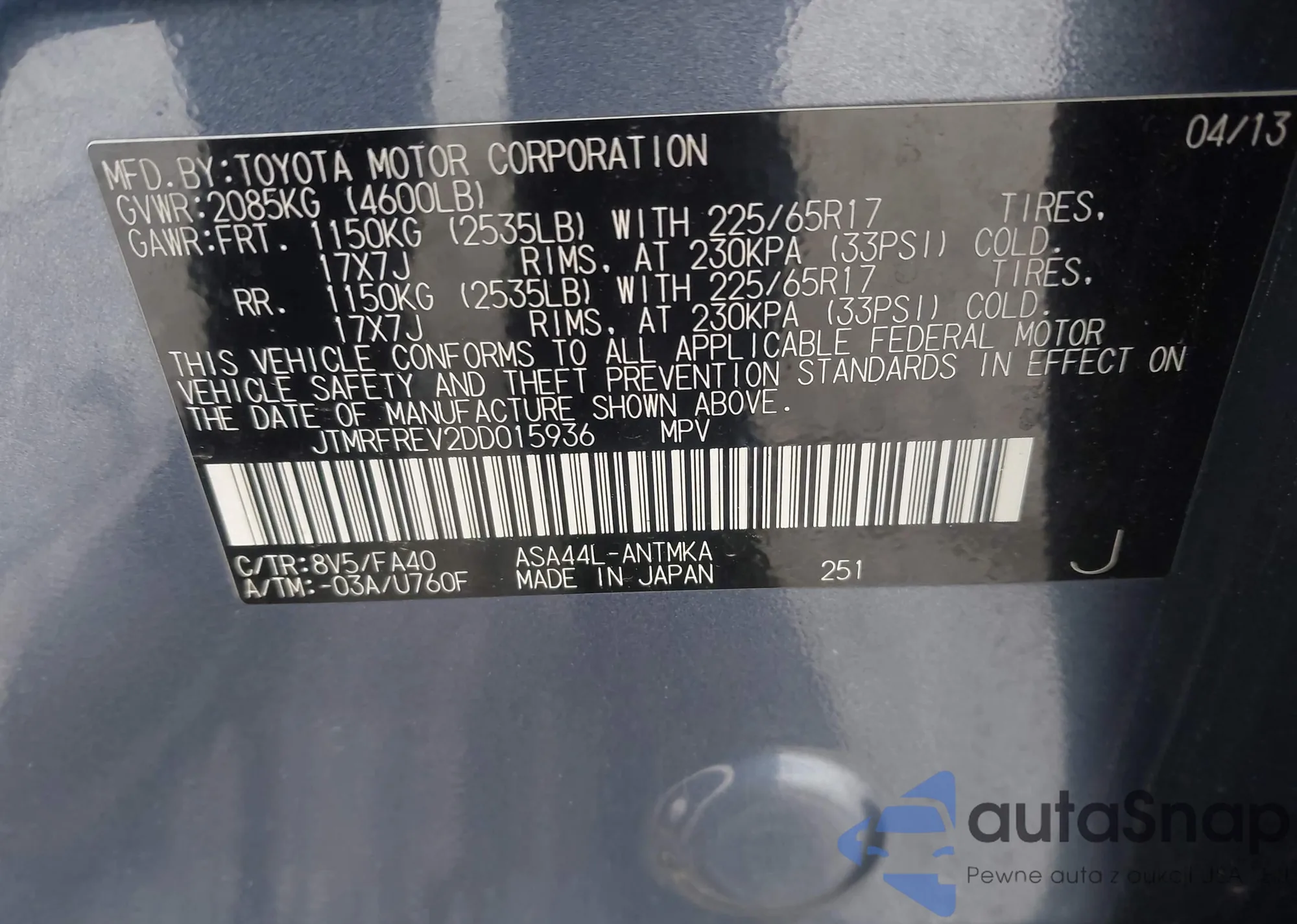 LOT: 42331329 VIN: JTMRFREV2DD015936