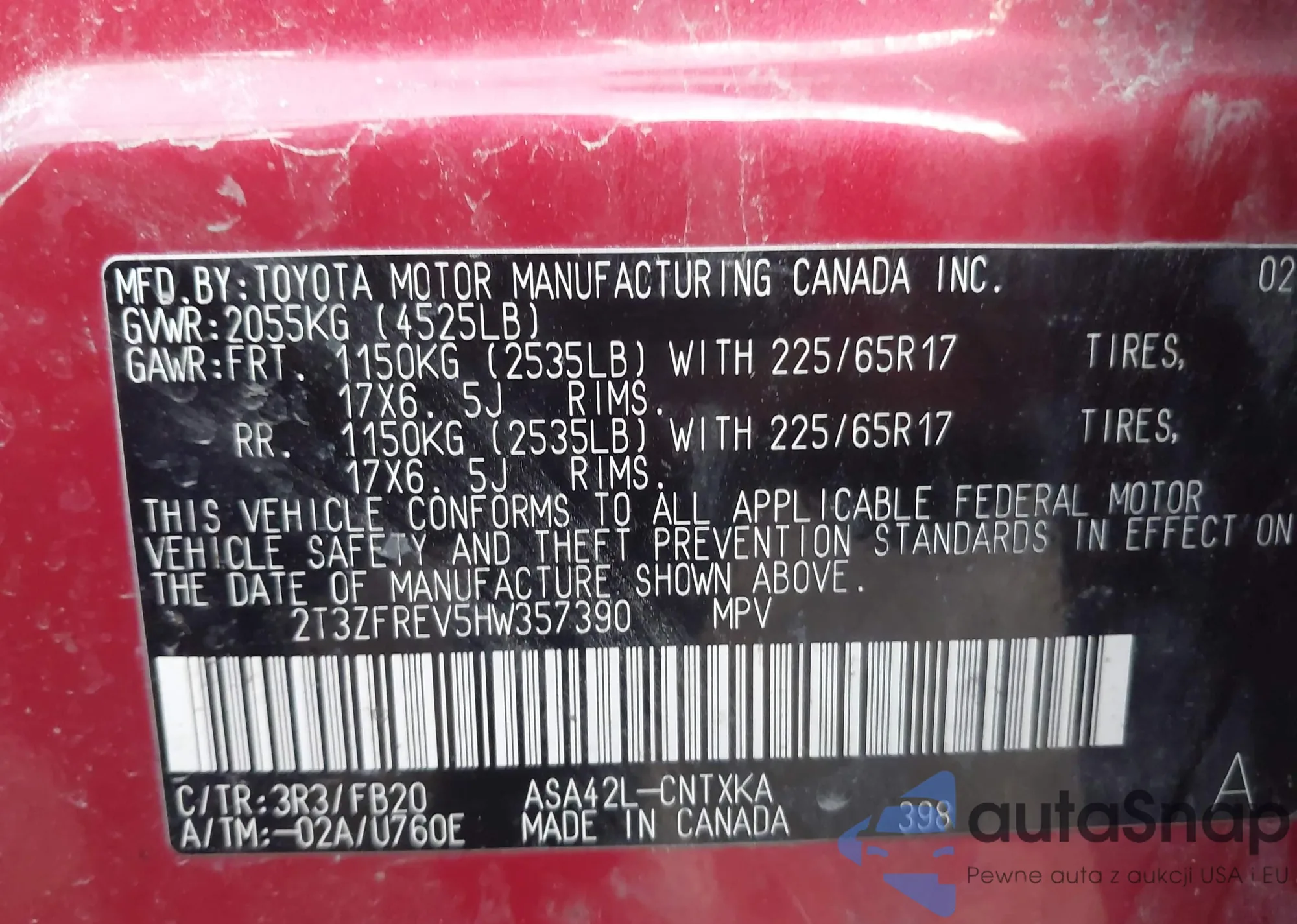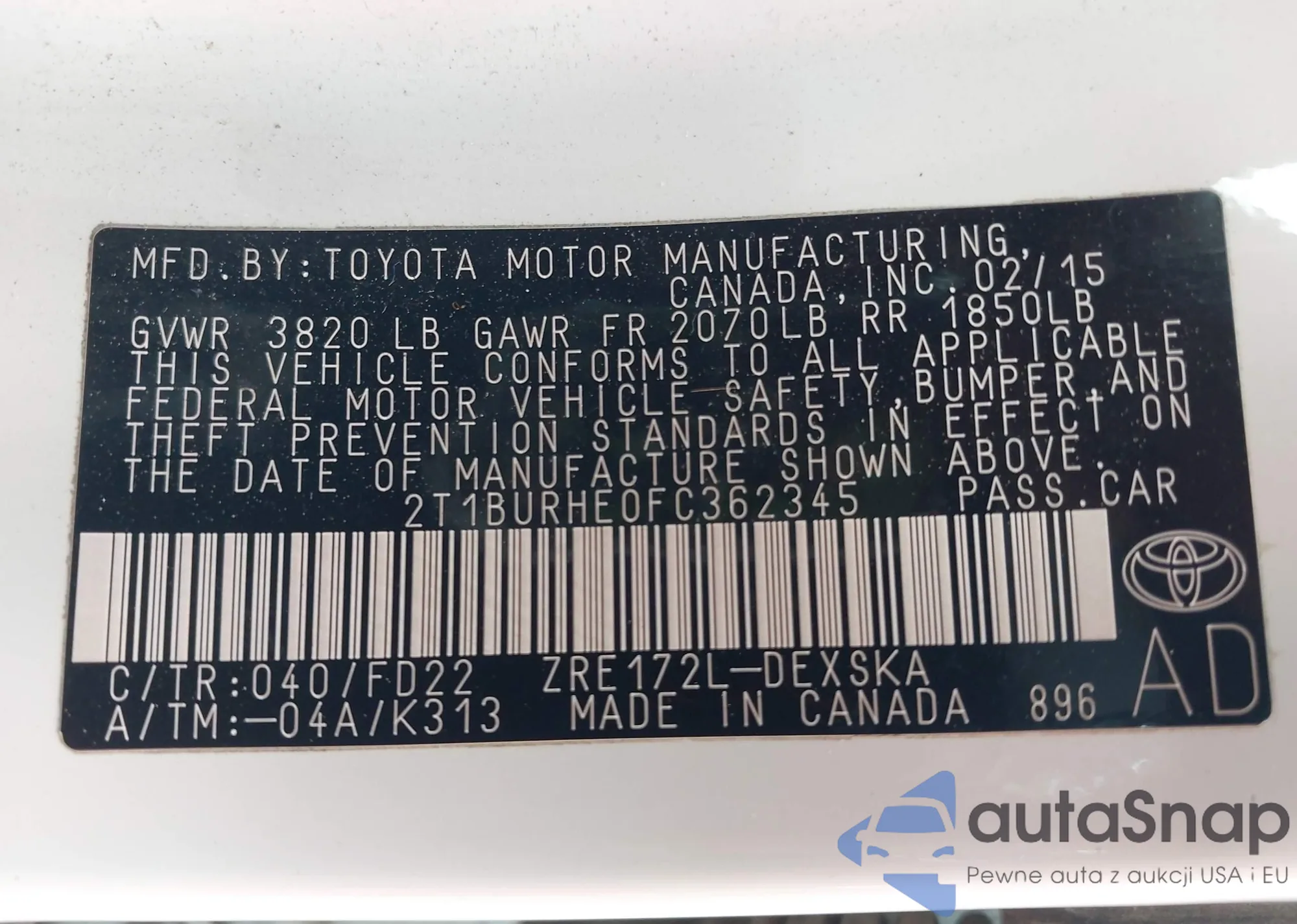 LOT: 42319607 VIN: 2T3WFREV3FW140663