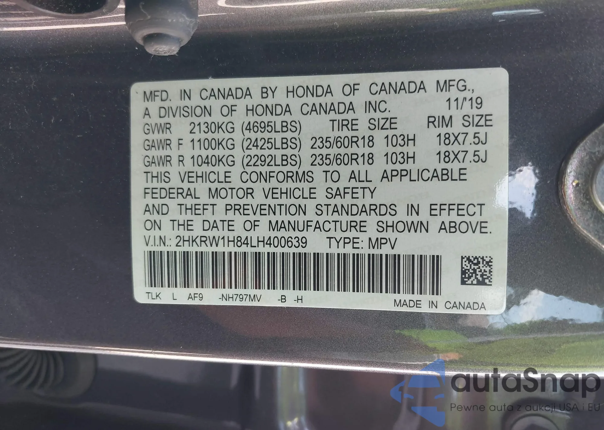 • VIN 2HKRW1H84LH400639