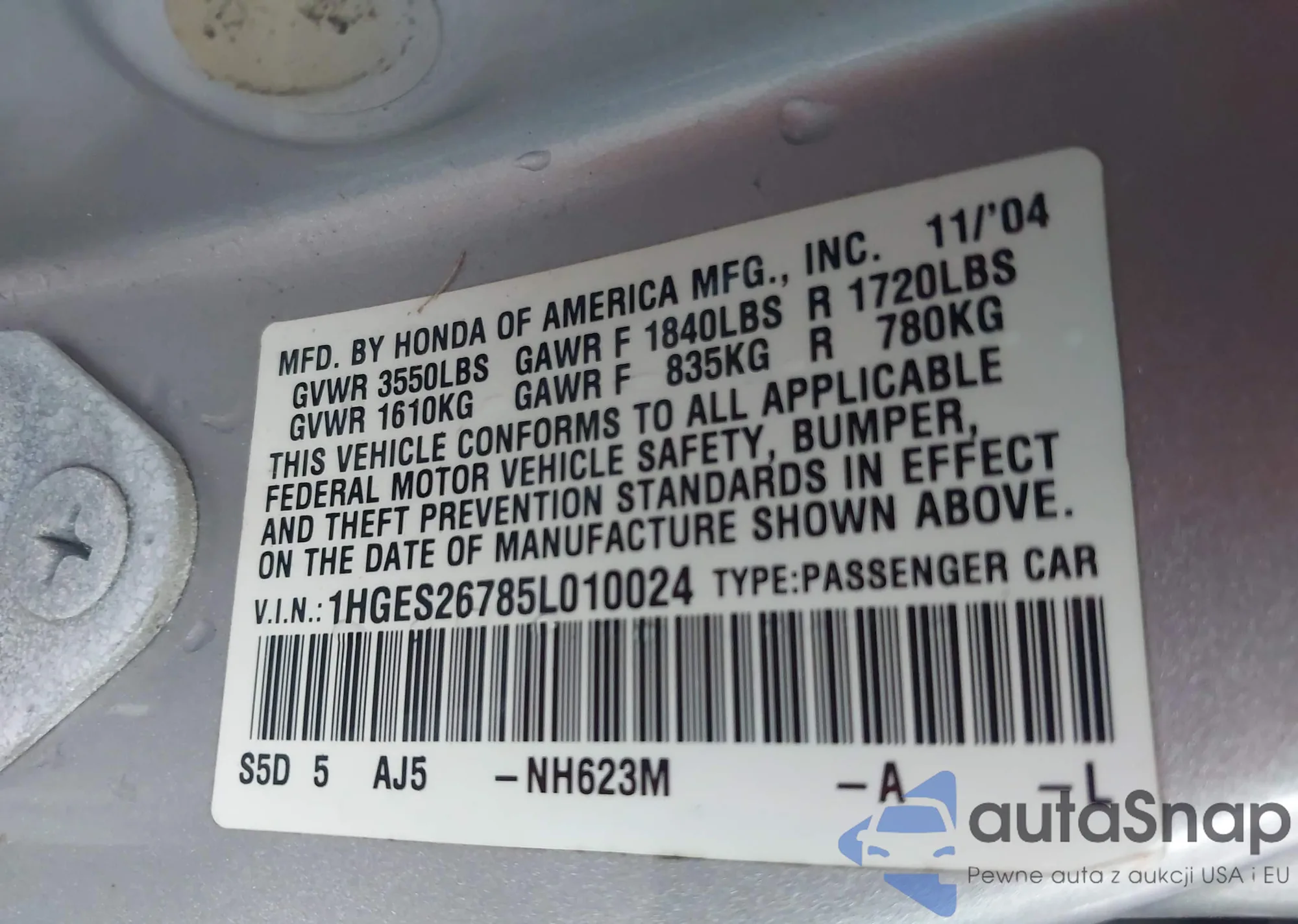 LOT: 42315782 VIN: 1HGES26785L010024