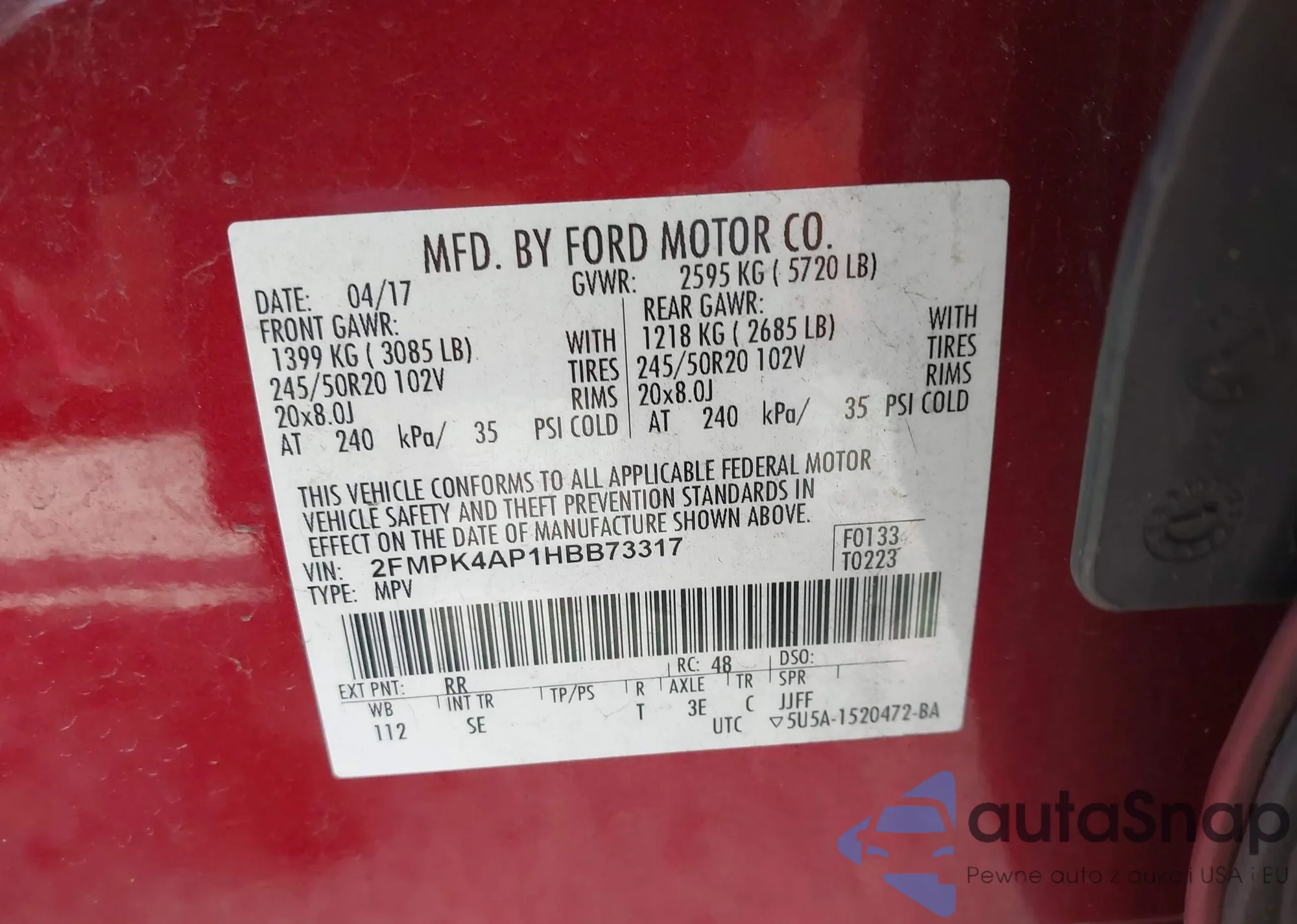 LOT: 42007923 VIN: 2FMPK4AP1HBB73317