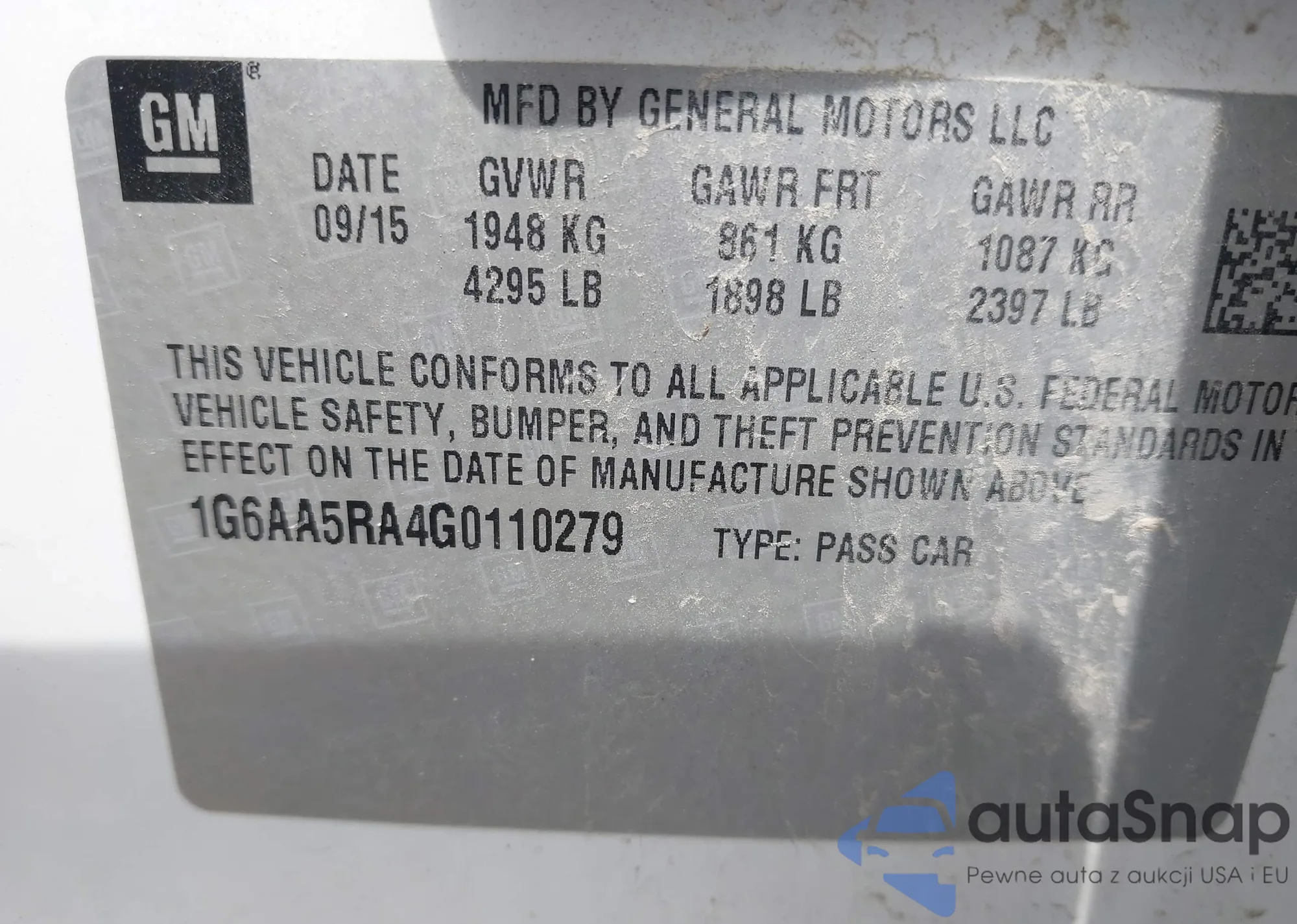 LOT: 42078659 VIN: 1G6AA5RA4G0110279