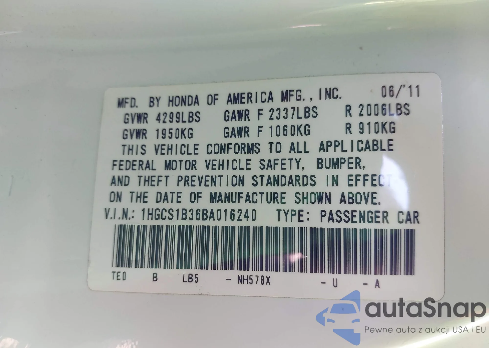 LOT: 42077033 VIN: 2HGFC2F59JH588351