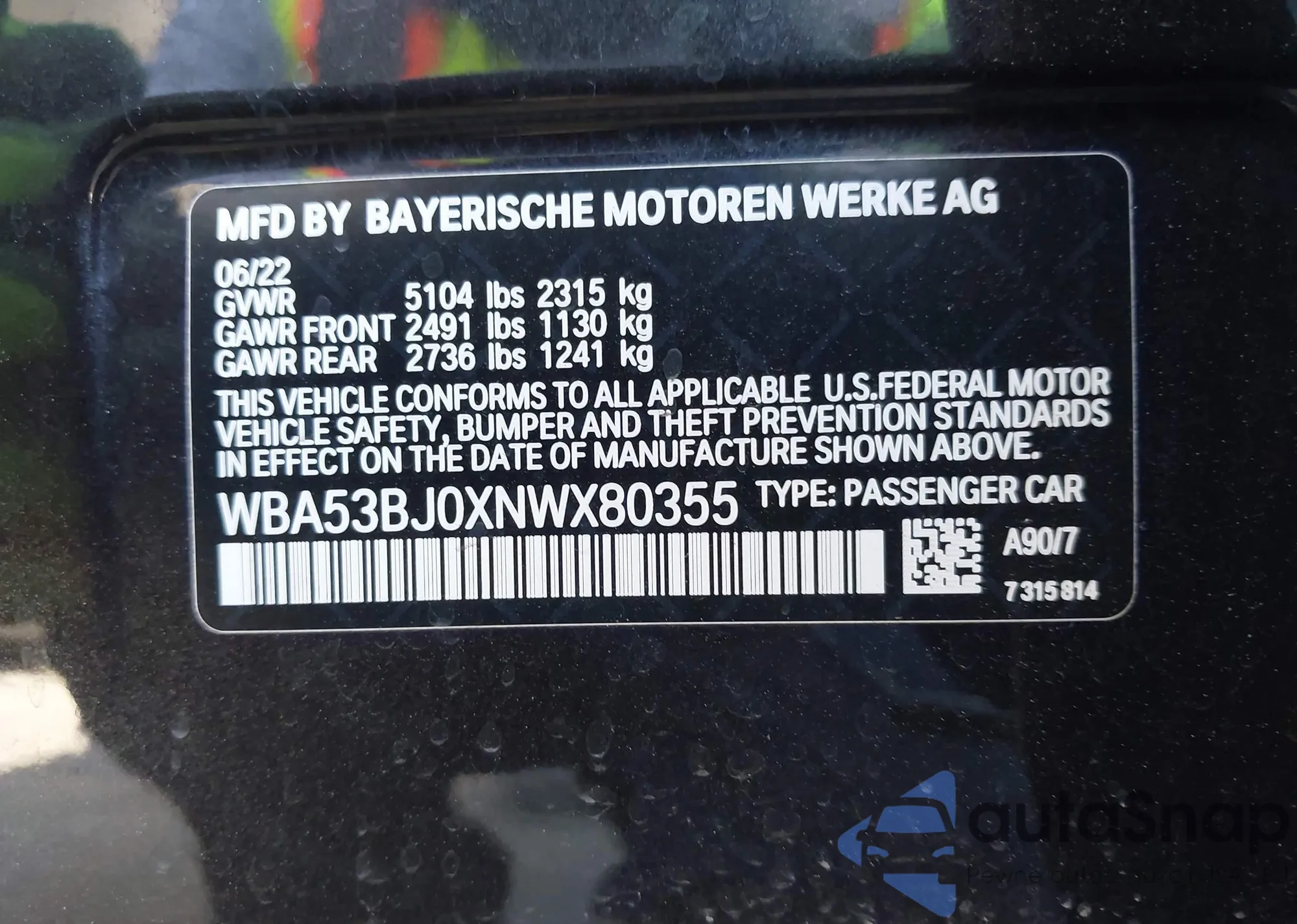 LOT: 41986937 VIN: WBA53BJ0XNWX80355