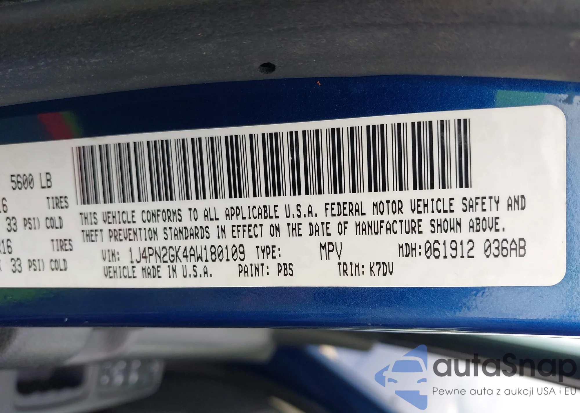 LOT: 42155603 VIN: 1J4PN2GK4AW180109