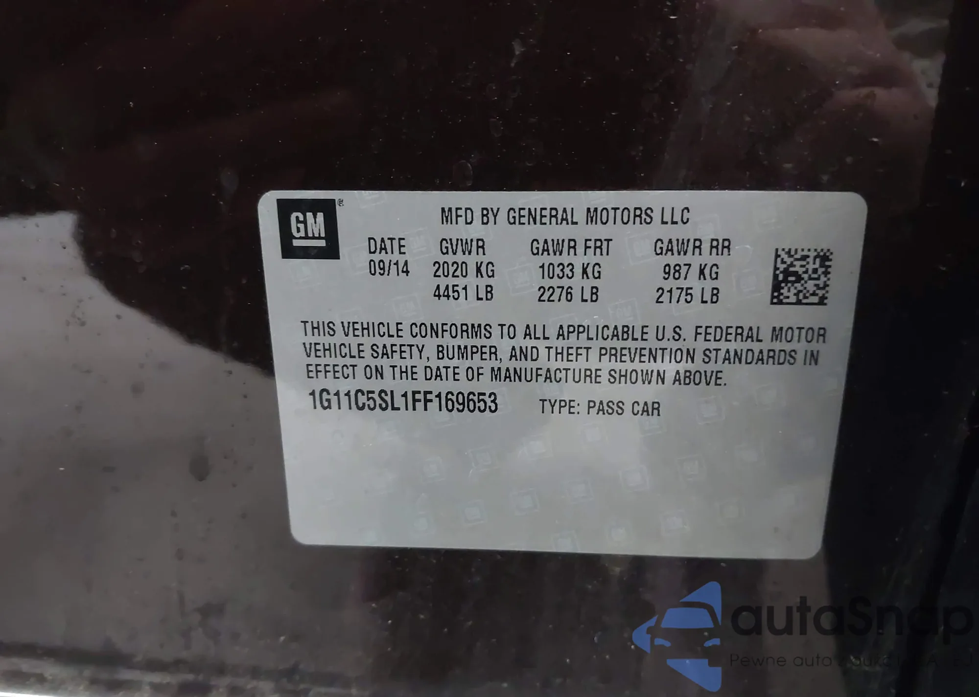 LOT: 42200161 VIN: 1G11C5SL1FF169653
