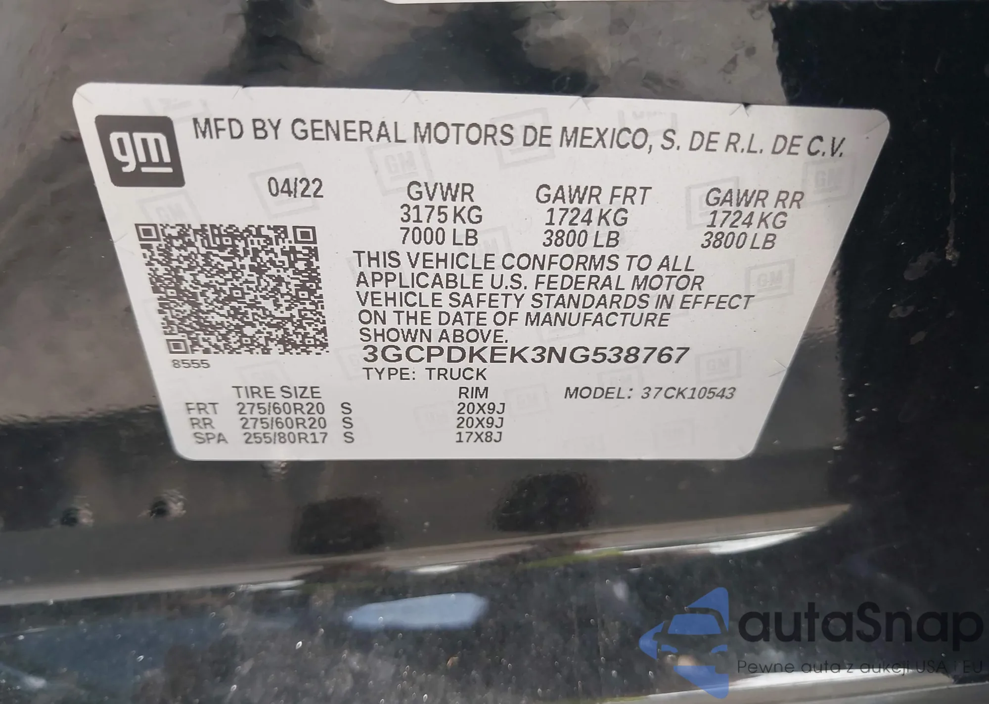 • VIN 3GCPDKEK3NG538767