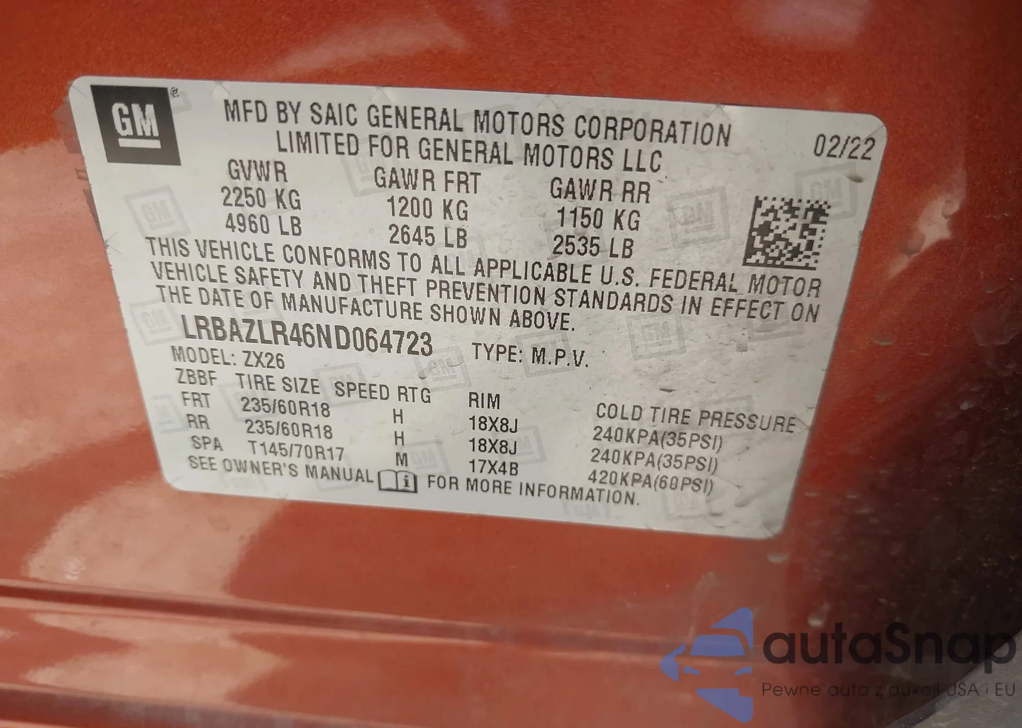 LOT: 42118191 VIN: LRBAZLR46ND064723